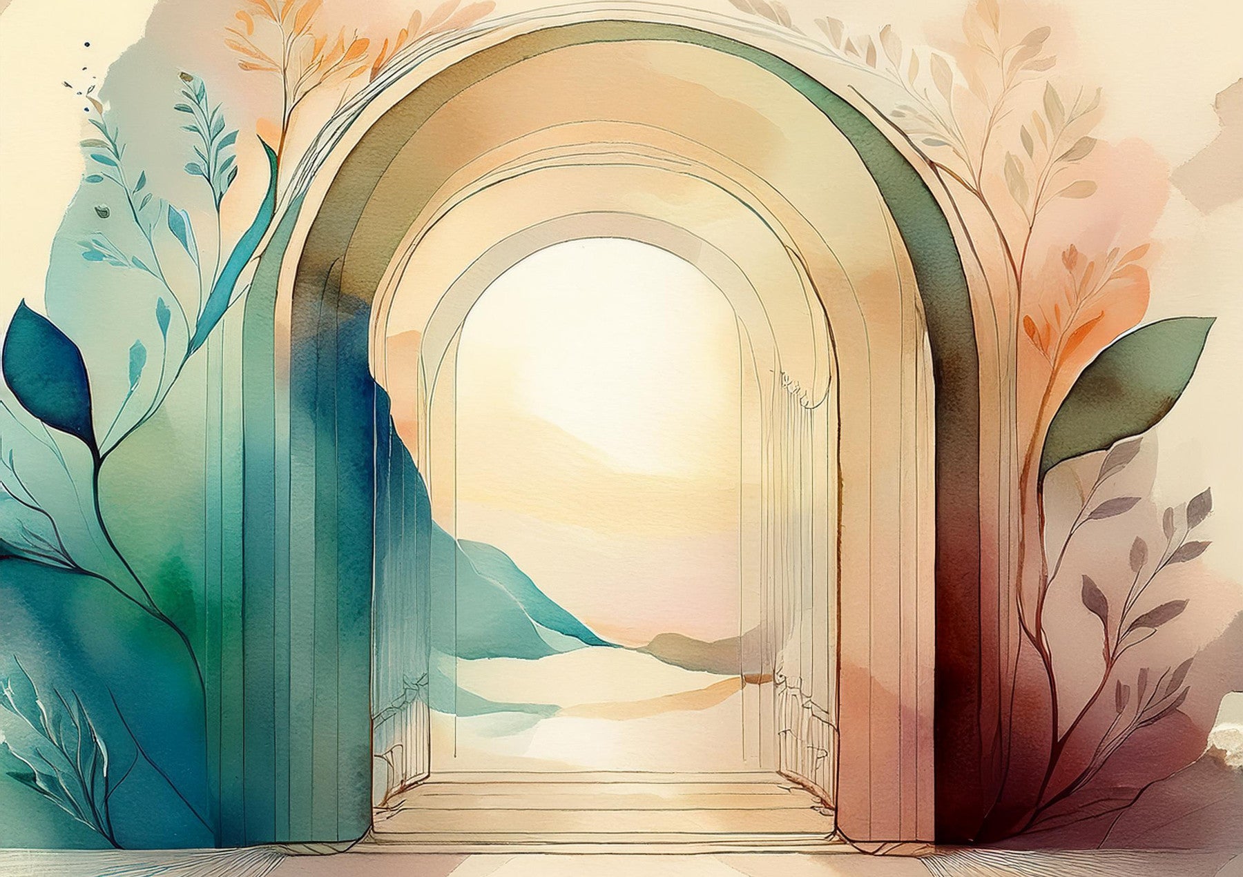 Journey through time with this captivating wallpaper. Inspired by classic architectural designs and rendered in a soft watercolor style, the piece portrays a series of arches that lead to a tranquil landscape. Delicate, hand-drawn botanicals flank the passageway, lending a whimsical and romantic touch. The interplay of earthy tones—peach, beige, teal—creates a sense of nostalgia and quiet contemplation. Perfect for adding a touch of history and artistry to your living space, this wallpaper offers a unique blend of old-world charm and modern sophistication.