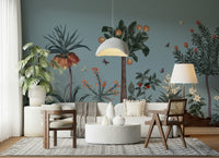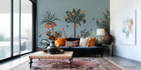 Transform any room with this serene botanical wallpaper for walls. The design presents a meticulously crafted landscape, filled with stylized trees, unique blossoms, and delicate butterflies against a muted blue background. Its earthy tones and sophisticated botanical illustration add a touch of organic elegance to your living room, bedroom, or hallway. The neutral colour palette blends smoothly with various interior styles, enhancing spaces with a calm and sophisticated ambiance. Invite the tranquility of nature into your home with this refined botanical design.
