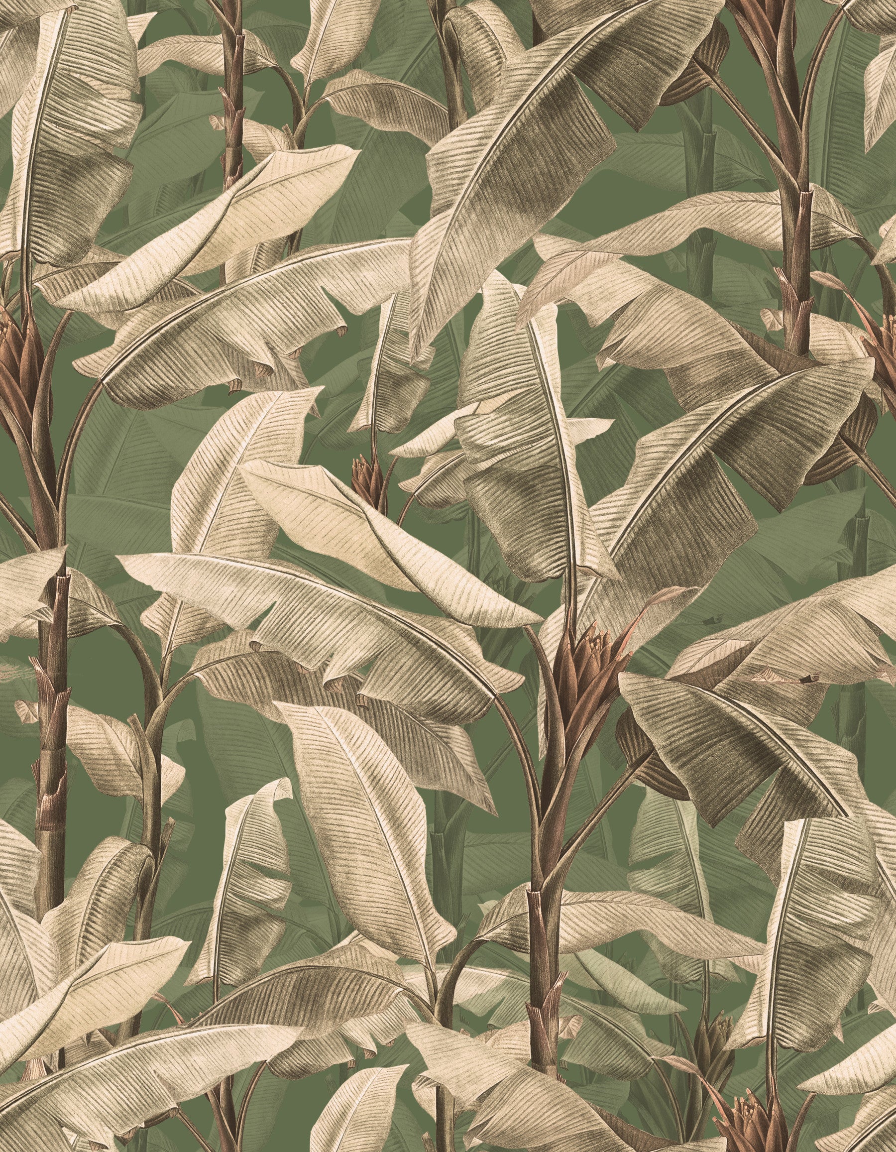 Immerse yourself in the beauty of nature with this captivating botanical wallpaper. Featuring a dense arrangement of banana leaves, rendered in exquisite detail, this design transports you to a lush, tropical paradise. The muted beige and green color palette evokes a sense of calm and sophistication, making it perfect for creating a tranquil atmosphere in any room. The seamless pattern ensures a cohesive and visually appealing effect, while the hand-drawn style lends a touch of vintage charm. Ideal for adding a touch of elegance and natural beauty to your home, this wallpaper is a stunning statement piece that blends seamlessly into various interior designs.