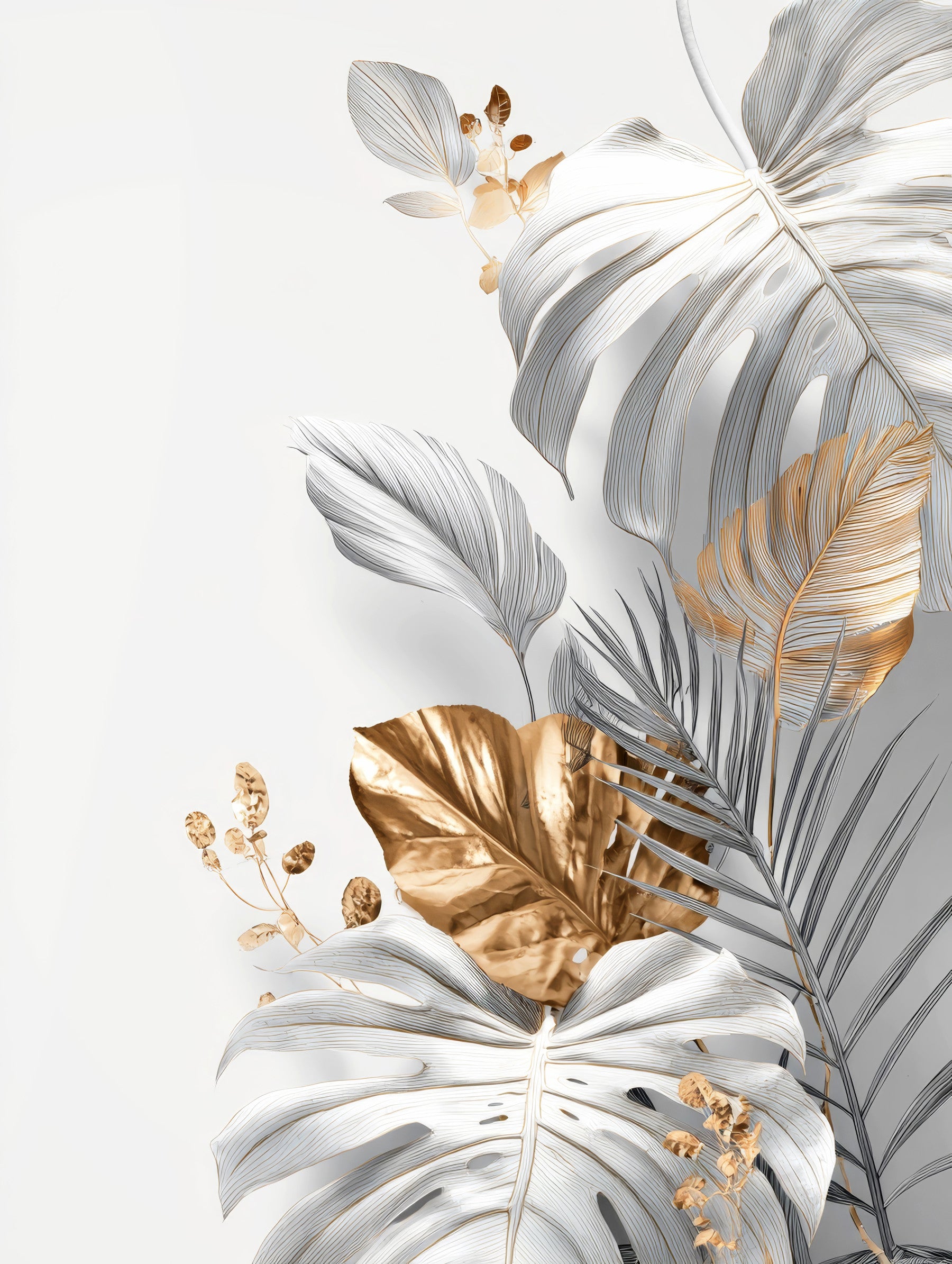 Embrace the allure of "Botanical Elegance," a wallpaper that marries the serenity of nature with a touch of gilded sophistication. Oversized Monstera leaves, rendered in a delicate white and lined with touches of gold, dominate the composition, creating a sense of lush, tropical grandeur. A striking golden leaf and small golden berries add warmth and a luxurious accent to the design, while the clean white background ensures a modern and versatile aesthetic. Perfect for adding a refined yet organic element to any space, this wallpaper embodies subtle opulence and timeless beauty.