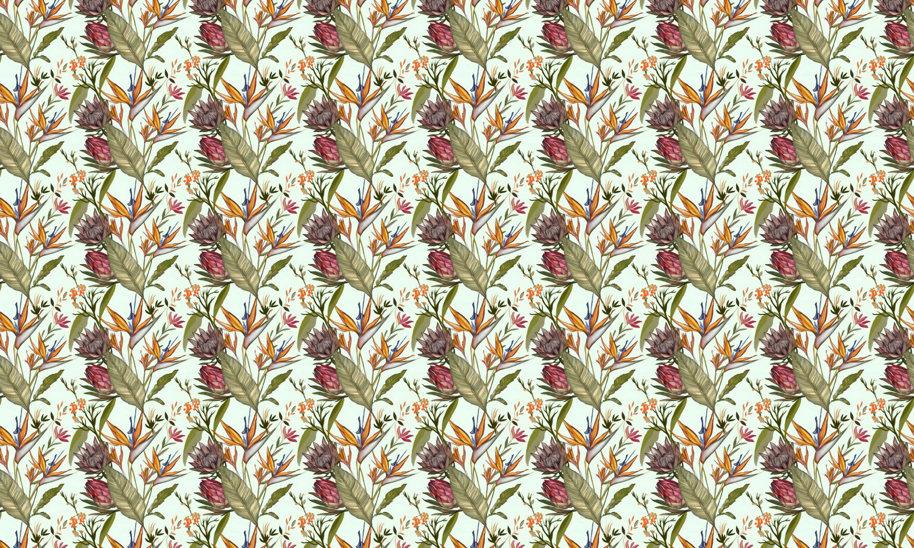 Introduce nature indoors with this detailed wallpaper. Repeating birds of paradise and other striking flowers and leaves provides an exotic aesthetic. This stunning wallpaper for walls breathes life into any room. The balanced mix of greens, oranges, and pinks creates a vibrant yet calming atmosphere. Suits living rooms, dining areas, or bedrooms. Its refined style makes it a statement piece. Bring a modern botanical touch.