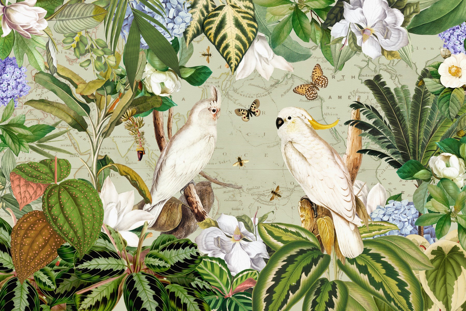 This wallpaper is a captivating blend of botanical artistry and cartographic intrigue. Two majestic white cockatoos, rendered in exquisite detail, are nestled amongst a profusion of tropical flora and delicate butterflies. The backdrop features a faded world map, hinting at distant lands and adventurous expeditions. The subtle color palette, dominated by soft greens, creams, and whites, creates a serene yet exotic atmosphere, perfect for adding a touch of refined elegance to any space. The wallpaper’s blend of vintage charm and natural beauty makes it an ideal choice for those who appreciate both history and nature.