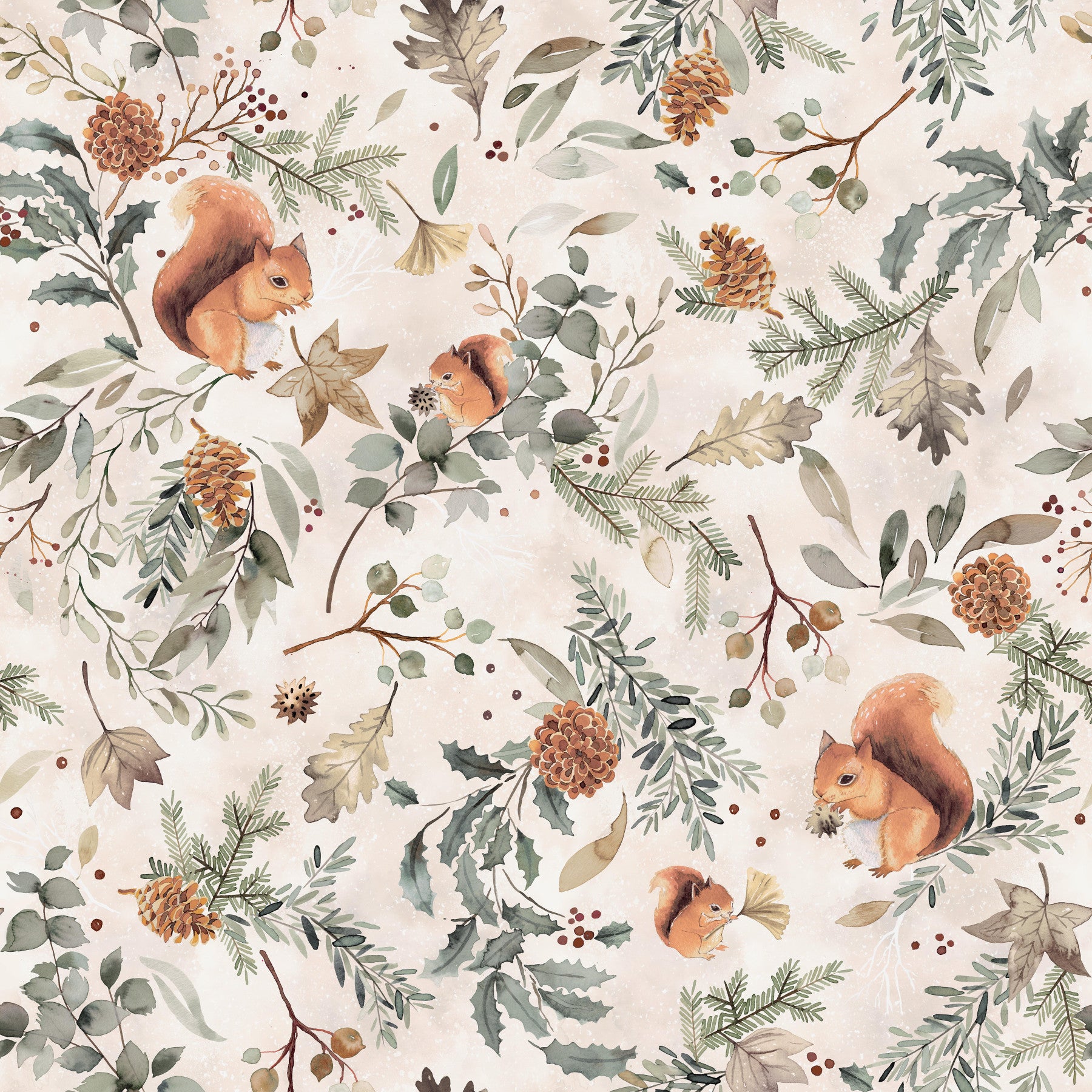 Embrace the charm of autumn with this enchanting wallpaper. A delicate watercolor design showcases a whimsical arrangement of rustic botanicals, including lush leaves in muted greens and browns, pinecones, and sprigs of berries. Playful squirrels are artfully nestled amongst the foliage, adding a touch of woodland whimsy to this serene, earthy palette. Perfect for creating a calm and inviting atmosphere in any digital space, this wallpaper evokes the peaceful beauty of a quiet forest scene, blending nature's elegance with a touch of rustic charm.