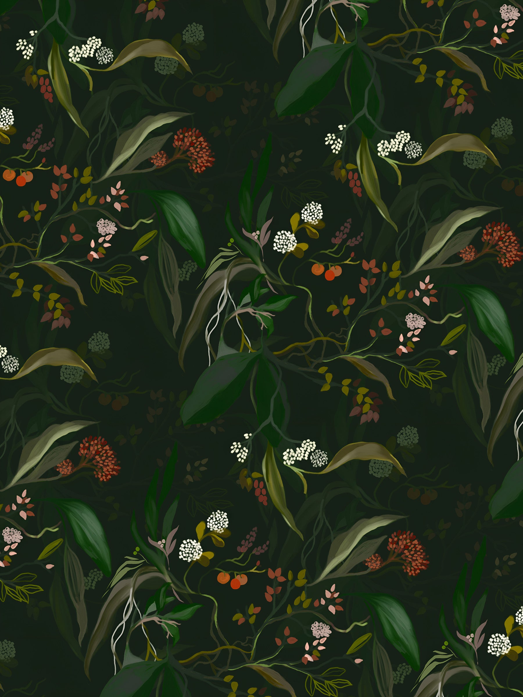 Transform your home with this dark floral wallpaper for walls, showcasing a rich, botanical design against a deep green backdrop. This pattern displays leaves, berries and small flowers, providing a peaceful yet luxurious aesthetic. The botanical pattern creates an inviting feel in living rooms, bedrooms or hallways. Introduce a sense of calm and sophisticated drama to your interior decor. Enhance rooms with nature's beauty.