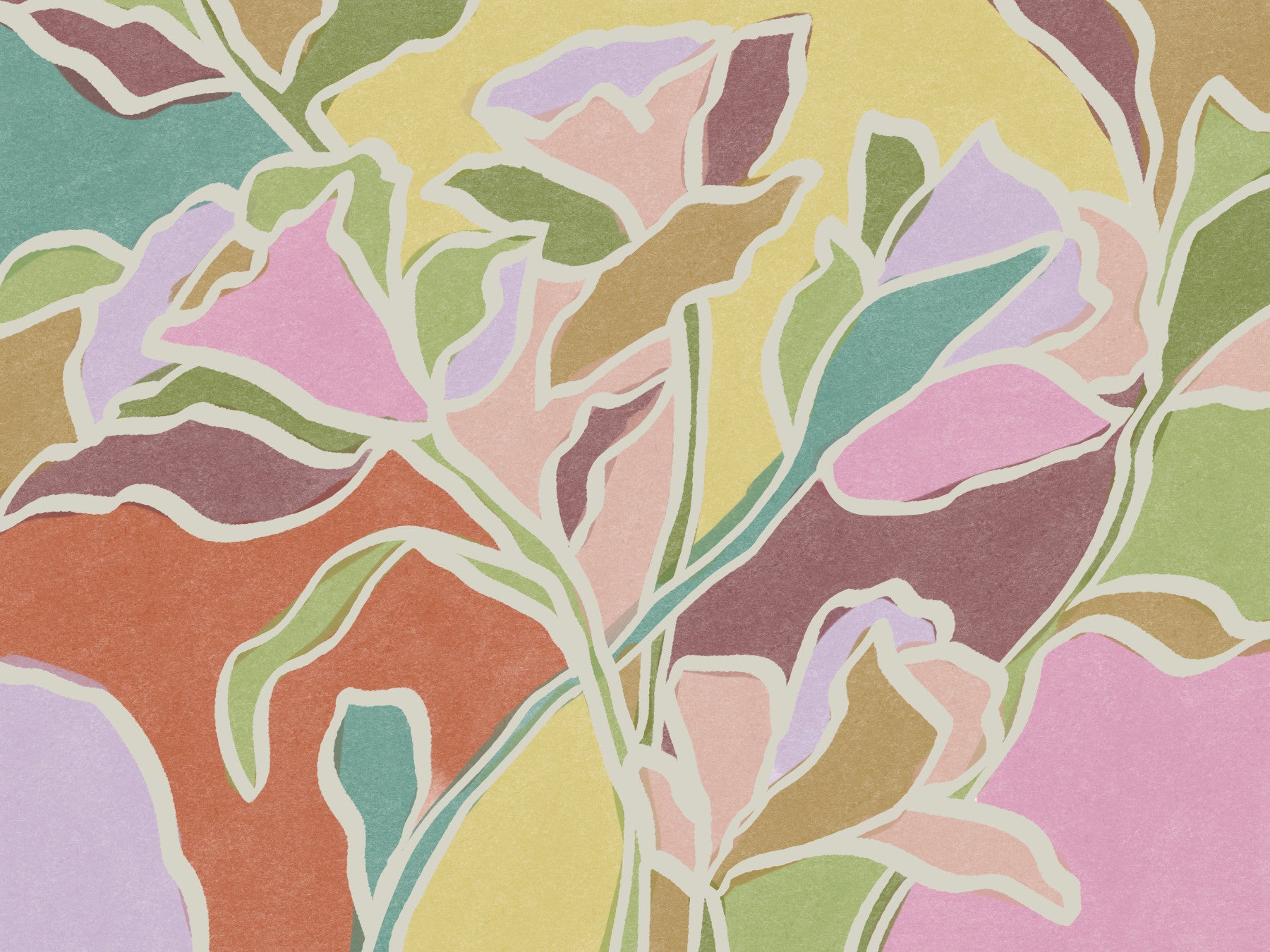 This abstract botanical wallpaper design features various flower-like forms in a vibrant array of hues. Pink, yellow, green, and brown all dance across the canvas, outlined in off-white to create an intriguing yet soothing effect. This wallpaper for walls works great for any room where one wants to set a happy mood such as living rooms or girls' bedrooms. The playful yet elegant design makes interiors more interesting while keeping the space calming and welcoming.