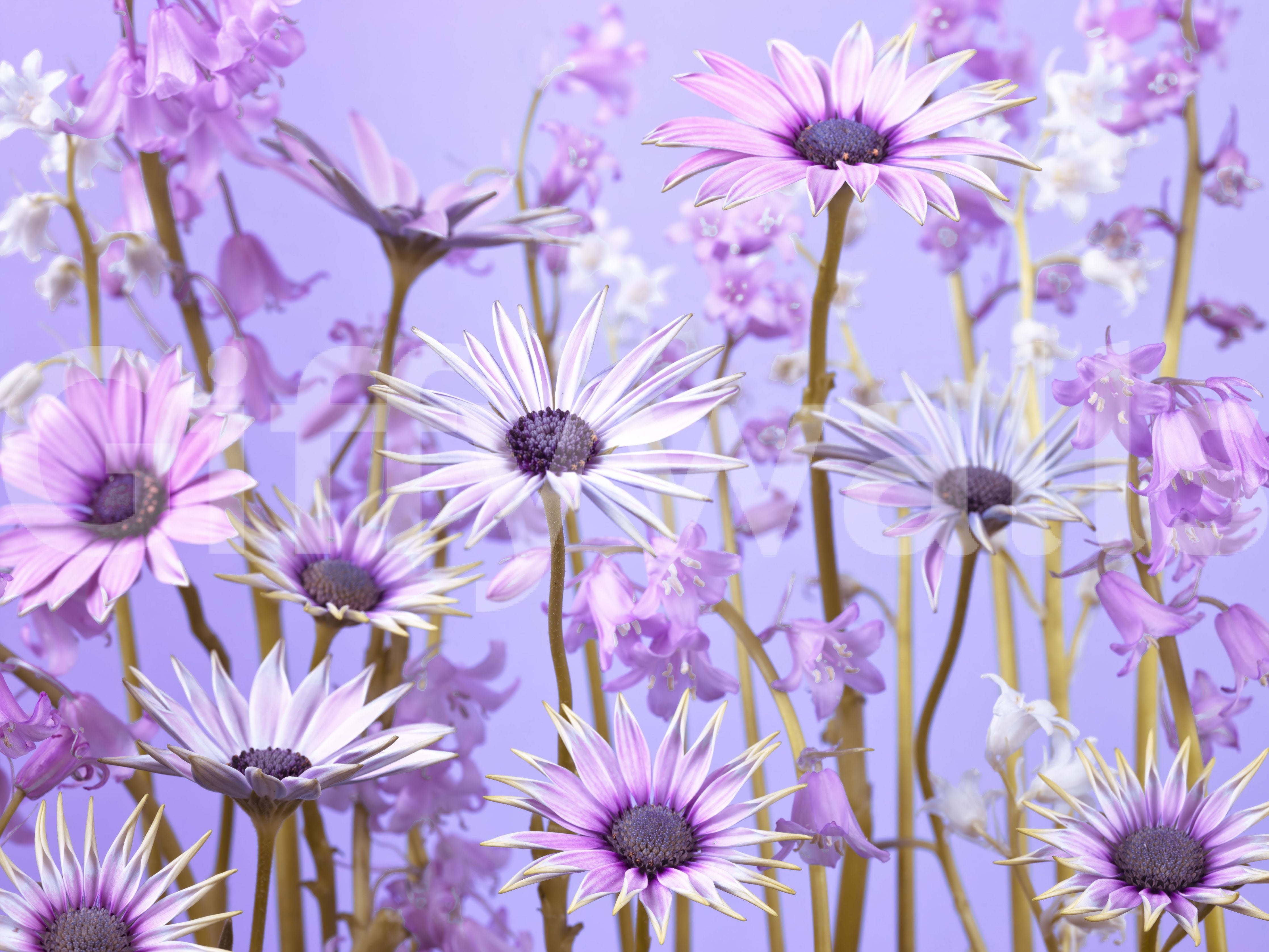 This wallpaper is a breathtaking celebration of spring's delicate beauty. A captivating arrangement of Osteospermum daisies, their petals a gentle blend of purple and white, are artfully juxtaposed with soft lavender bluebells. The composition is both sophisticated and calming, the muted colors creating a sense of tranquility and peace. This wallpaper is perfect for adding a touch of understated elegance to any room, making it an ideal choice for bedrooms, living areas, or even home offices where a relaxing and inspiring atmosphere is desired. The soft focus enhances the romantic, ethereal quality of the floral display.