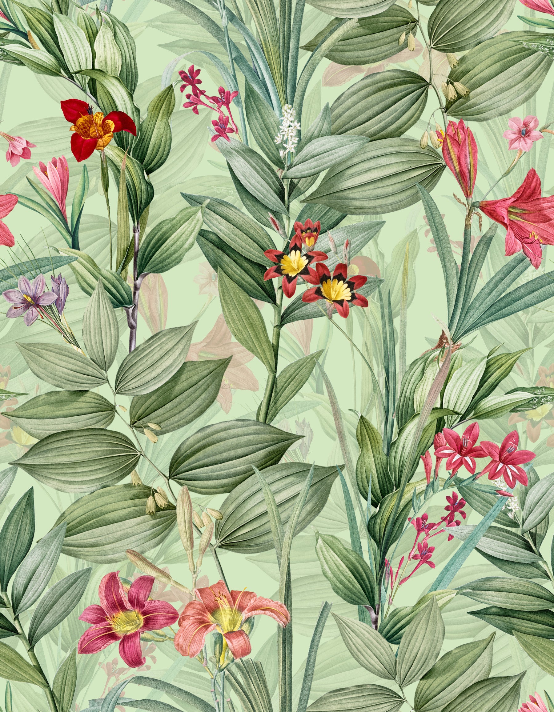 Immerse yourself in the serene beauty of 'Botanical Rhapsody,' a wallpaper design that captures the essence of a lush garden. Delicate watercolor illustrations of lilies, daylilies, and other exotic blooms are meticulously rendered against a soft, pale green backdrop. The intricate details of the leaves and flowers create a captivating and tranquil atmosphere, perfect for adding a touch of nature-inspired elegance to any room. The seamless pattern ensures a harmonious flow, inviting a sense of calm and sophistication.