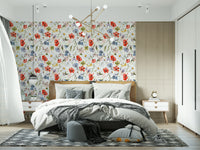 Enhance your living space with the tranquil charm of a botanical garden using this beautiful wallpaper by Uta Naumann. Watercolour wildflowers in soft shades of coral, periwinkle blue, and sage green create an inviting and peaceful ambiance. The watercolour medium gives the flowers a delicate and organic look, perfect for creating a soothing atmosphere. This wallpaper for walls serves as an elegant backdrop in a bedroom, bathroom, living room, or dining room. This design complements both modern and traditional interiors with its soft colour palette and nature-inspired theme, providing a calm and elegant atmosphere to any home.