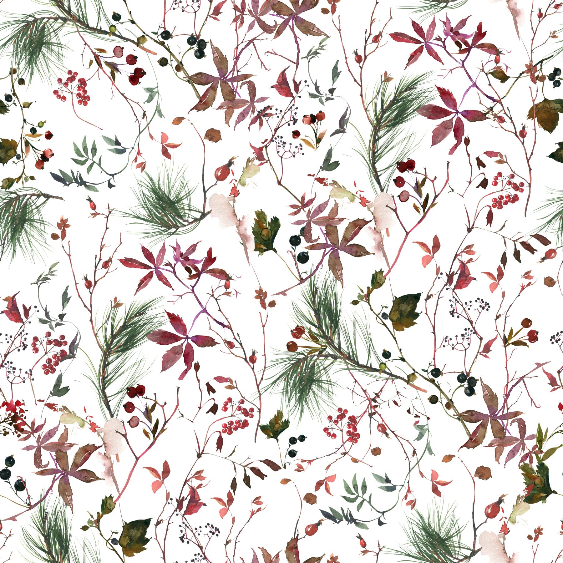 Infuse a timeless charm into your home with this botanical-inspired wallpaper for walls. This design combines watercolour-style renderings of branches, pine needles, leaves and berries in shades of green, red, and brown set against a white background. Ideal for bedrooms, living rooms, or dining areas, this wallpaper adds a touch of understated elegance. The natural motif and soft colour palette make it an excellent choice for creating a calming and visually appealing atmosphere. Let this wallpaper elevate your interior spaces with its subtle beauty and organic touch.