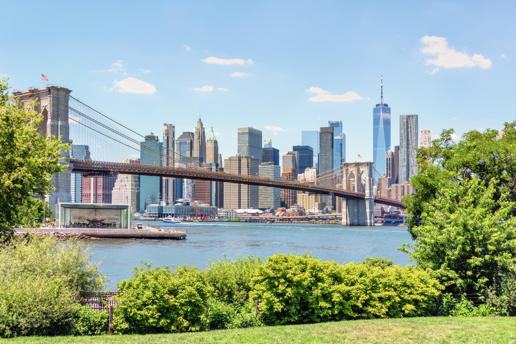 Invite the dynamic energy of New York City into your home with this impressive wallpaper for walls. This design features the iconic Brooklyn Bridge framing the towering skyscrapers of Manhattan. The bright, clear sky complements the tranquil water, making this a perfect choice for living rooms, dining rooms, or offices. The cityscape creates depth and adds a sense of space. The detailed architectural elements enhance interior spaces, bringing a touch of urban sophistication to your décor. This wallpaper serves as a statement piece, inspiring creativity and a sense of wonder.