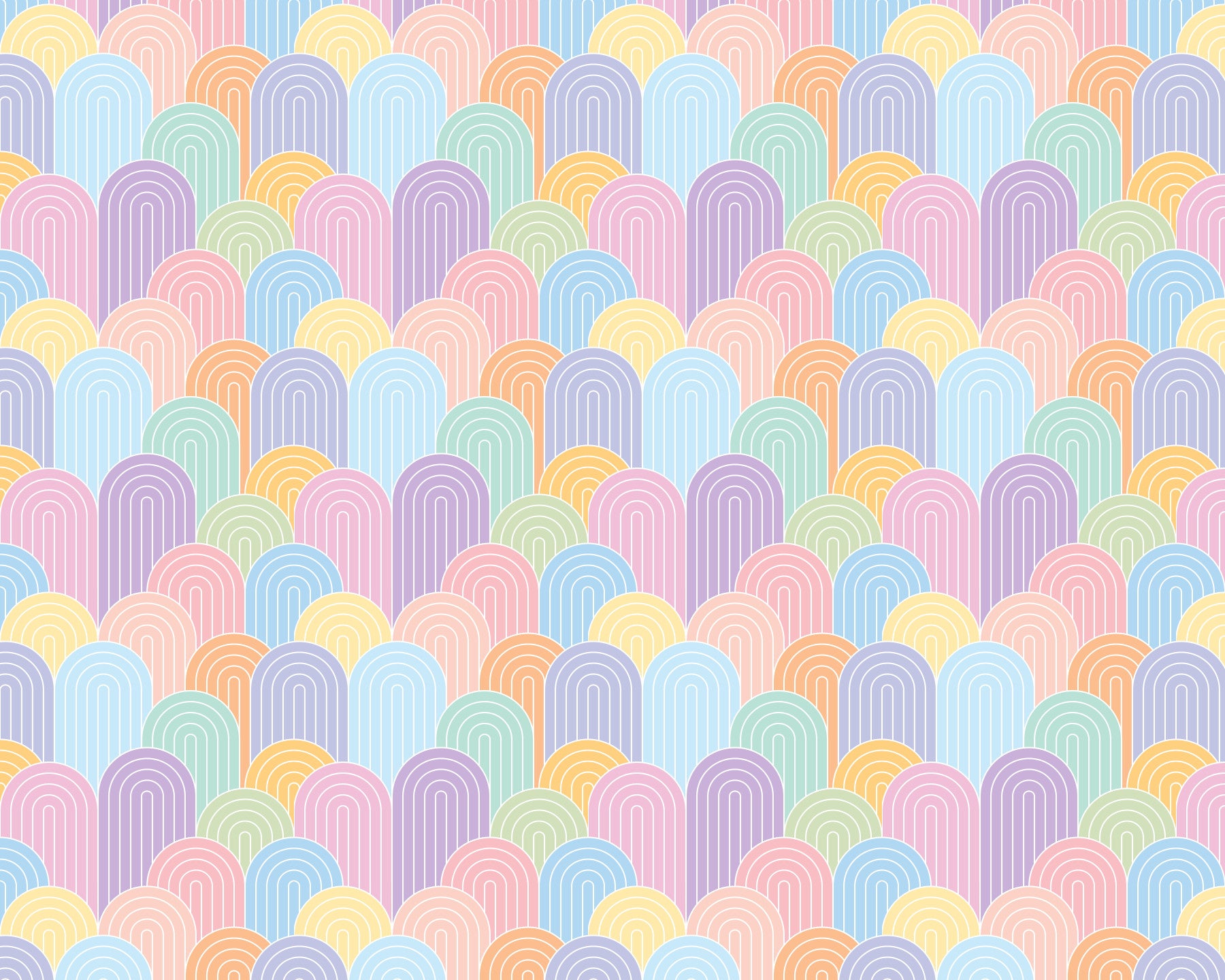 Immerse yourself in a dreamy landscape of 'Bright Pastel Rainbows'. This captivating wallpaper showcases a mesmerizing pattern of overlapping, pastel-hued arches, reminiscent of soft, rounded rainbow hills. The gentle color gradation creates a soothing and whimsical atmosphere, perfect for adding a touch of playful elegance to any child's nursery or playroom. The seamless repeat ensures a continuous flow of color and visual harmony, making it an ideal choice for a calming and aesthetically pleasing backdrop.