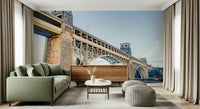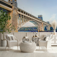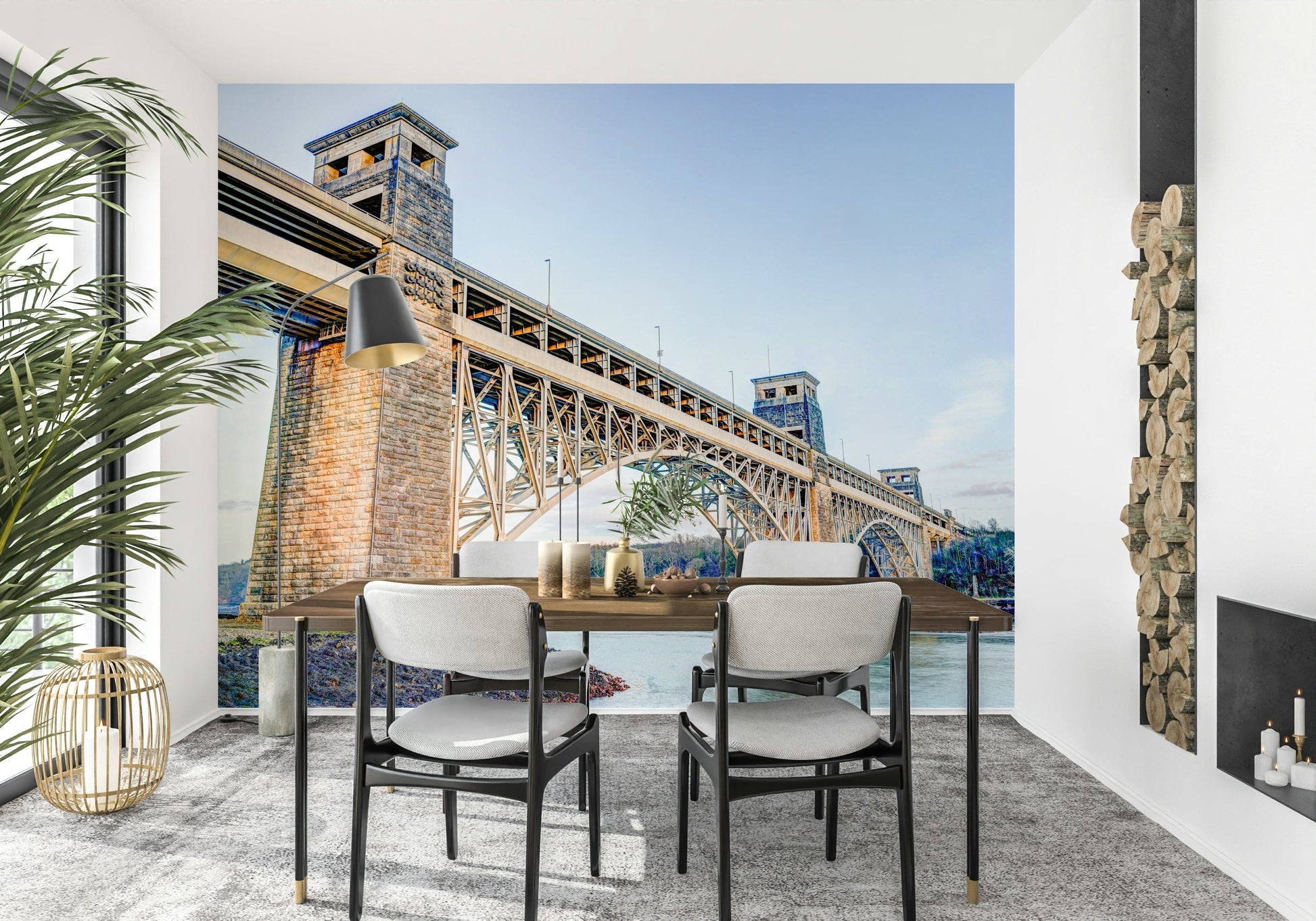Transform your space with this stunning view of the Britannia Bridge, a striking testament to architectural ingenuity and natural beauty. The detailed stonework and steel construction create a compelling focal point in any room. Soft morning light accentuates the textures and adds warmth. The neutral colour palette of greys, blues, and earth tones allows this wallpaper for walls to blend seamlessly with various interior styles. Install it in a living room, study, or entryway to make a grand statement. This wallpaper brings sophistication and a touch of the outdoors to your décor.