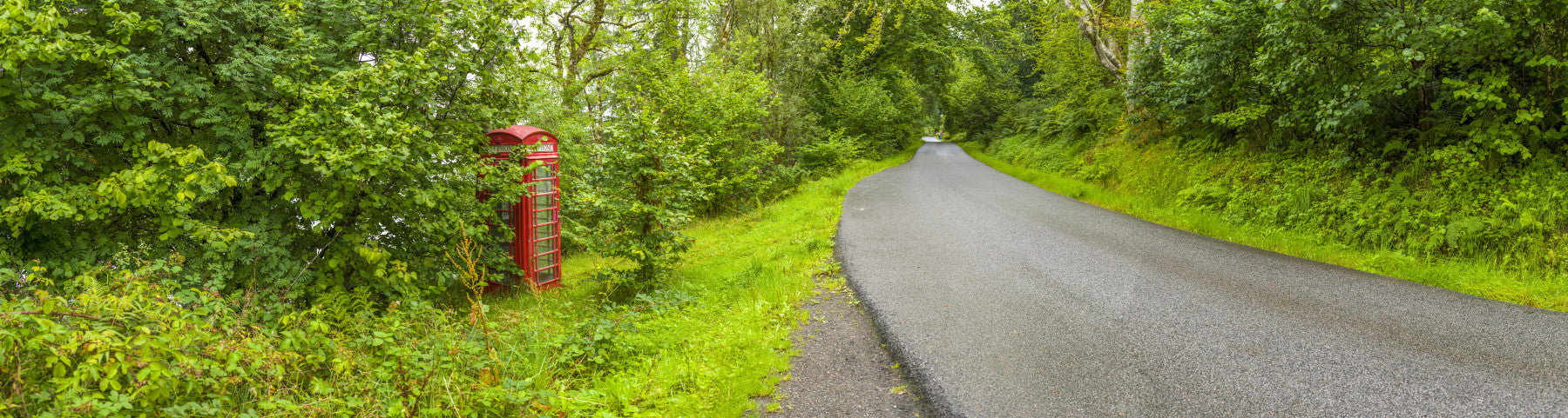 Panoramic mural of a remote asphalt road and a striking cultural landmark. British Call Box.