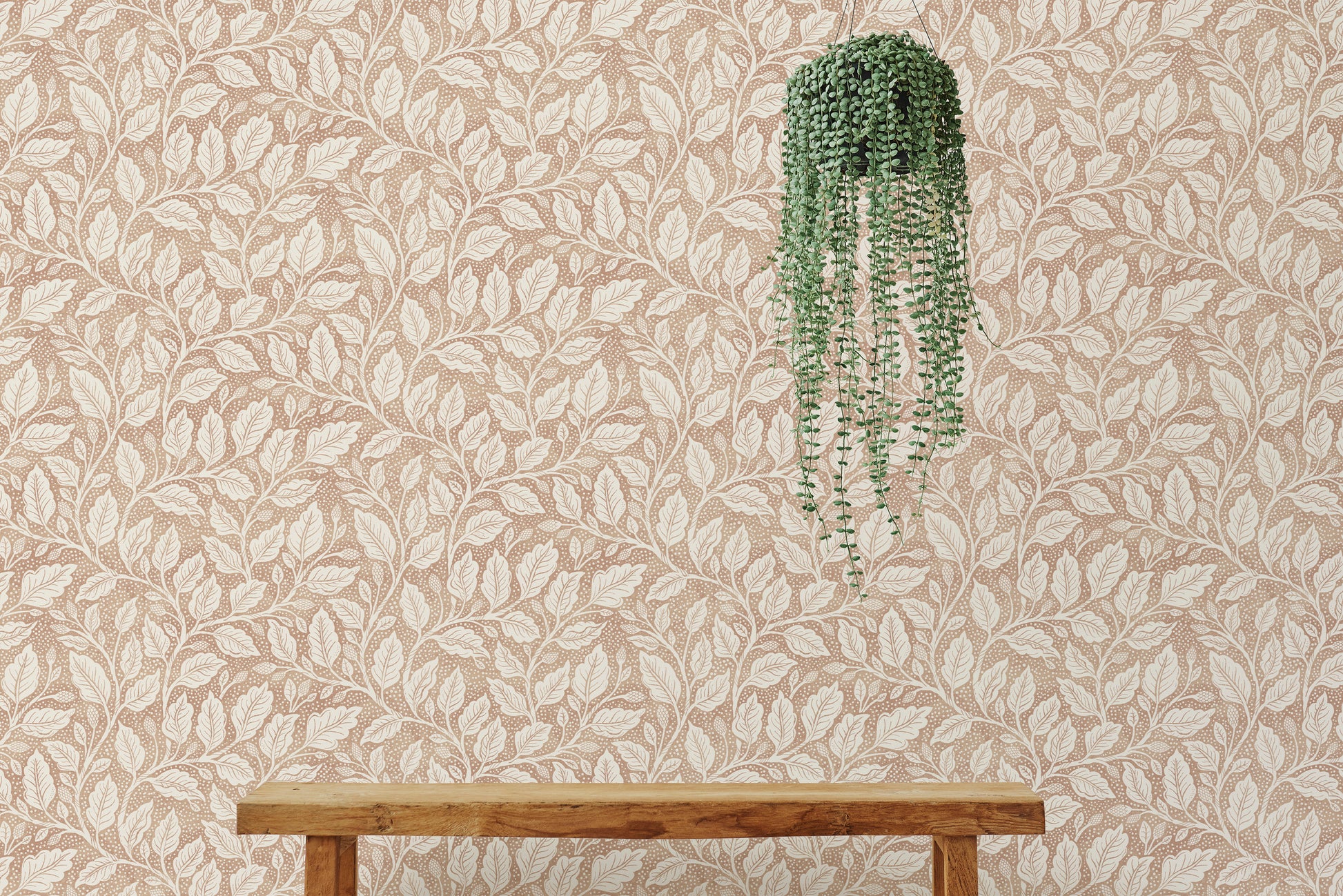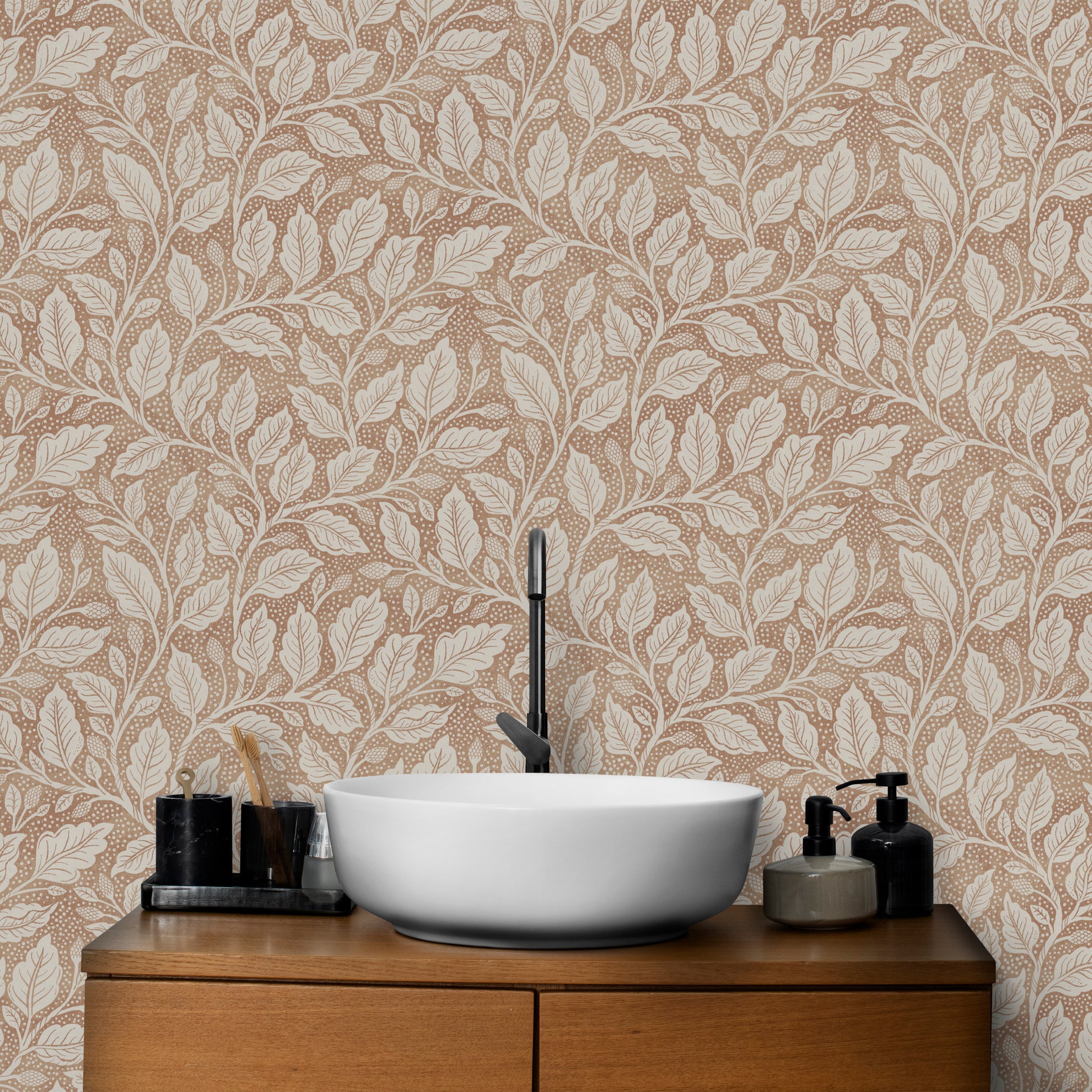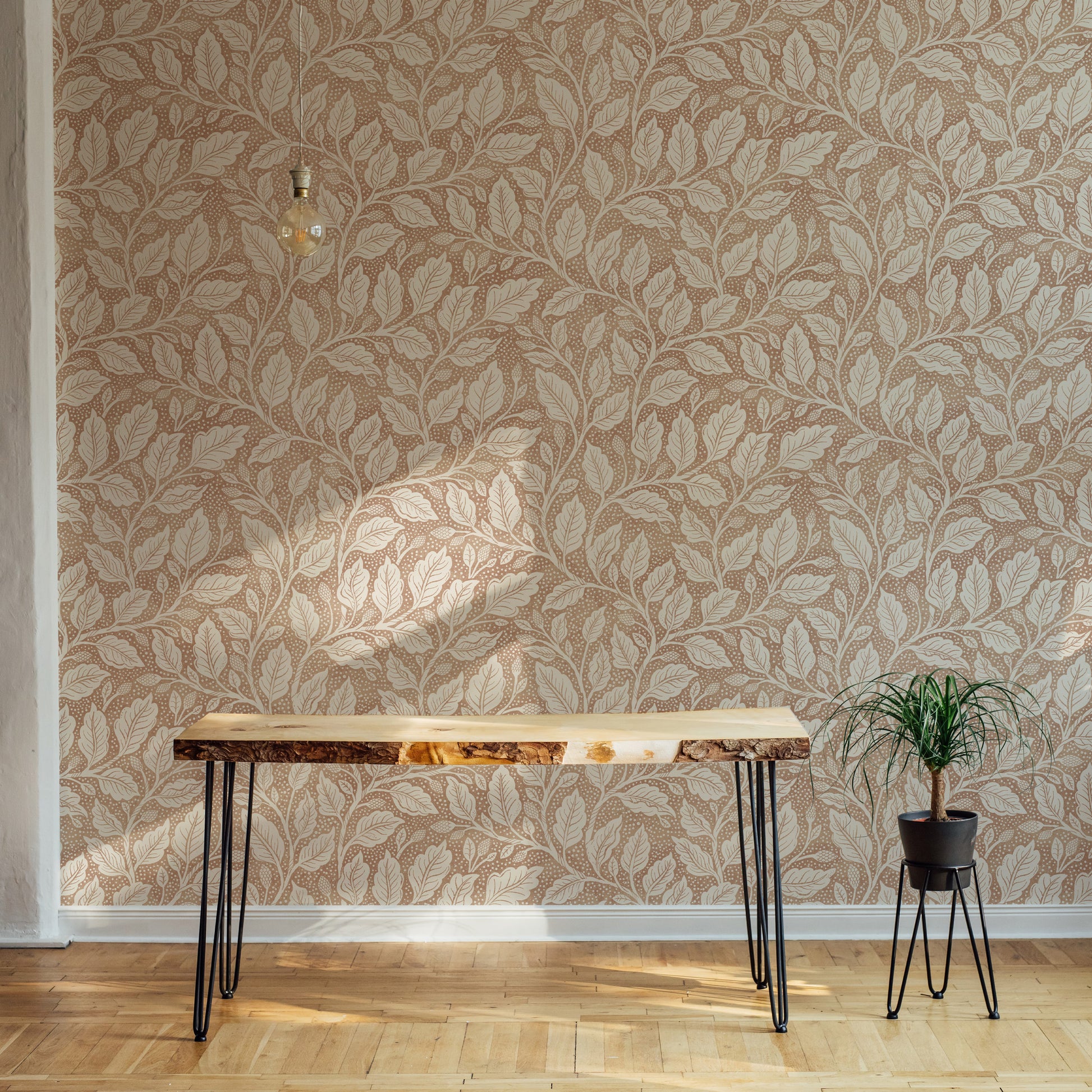 Embrace the subtle elegance of 'Brown Budding Branches,' a digital wallpaper design featuring a captivating interplay of off-white botanical motifs on a textured brown backdrop. Intricate, stylized leaves and budding blossoms create a seamless pattern, reminiscent of vintage botanical illustrations. The delicate off-white branches gracefully intertwine against a speckled, earthy brown ground, evoking a sense of tranquility and natural beauty. Perfect for adding a touch of understated sophistication to any digital device, this wallpaper offers a calming and visually rich experience. The earthy tones and detailed design create a sophisticated yet calming atmosphere.