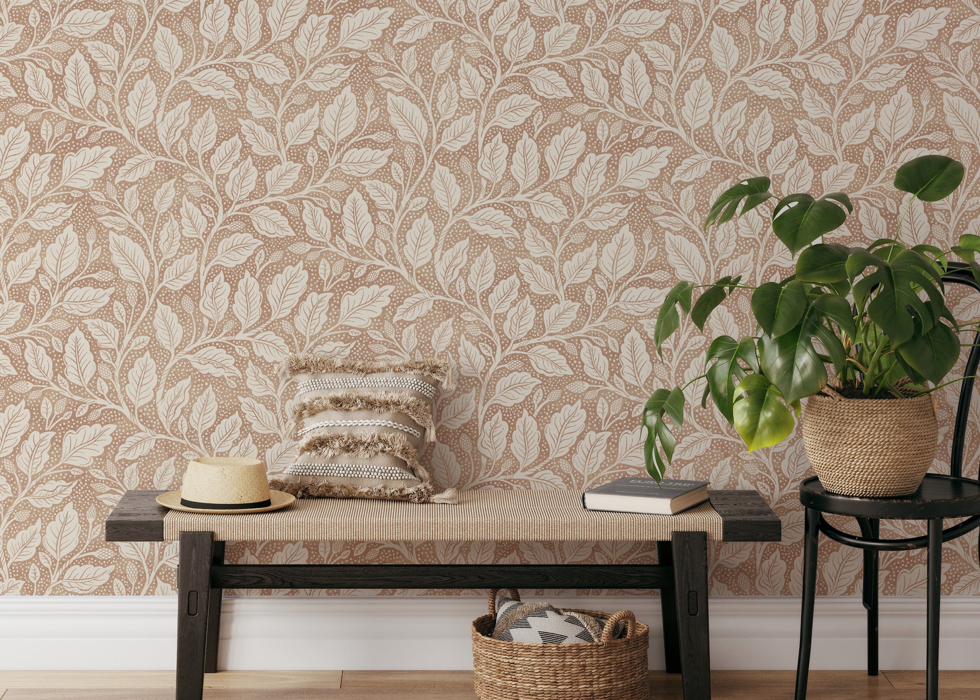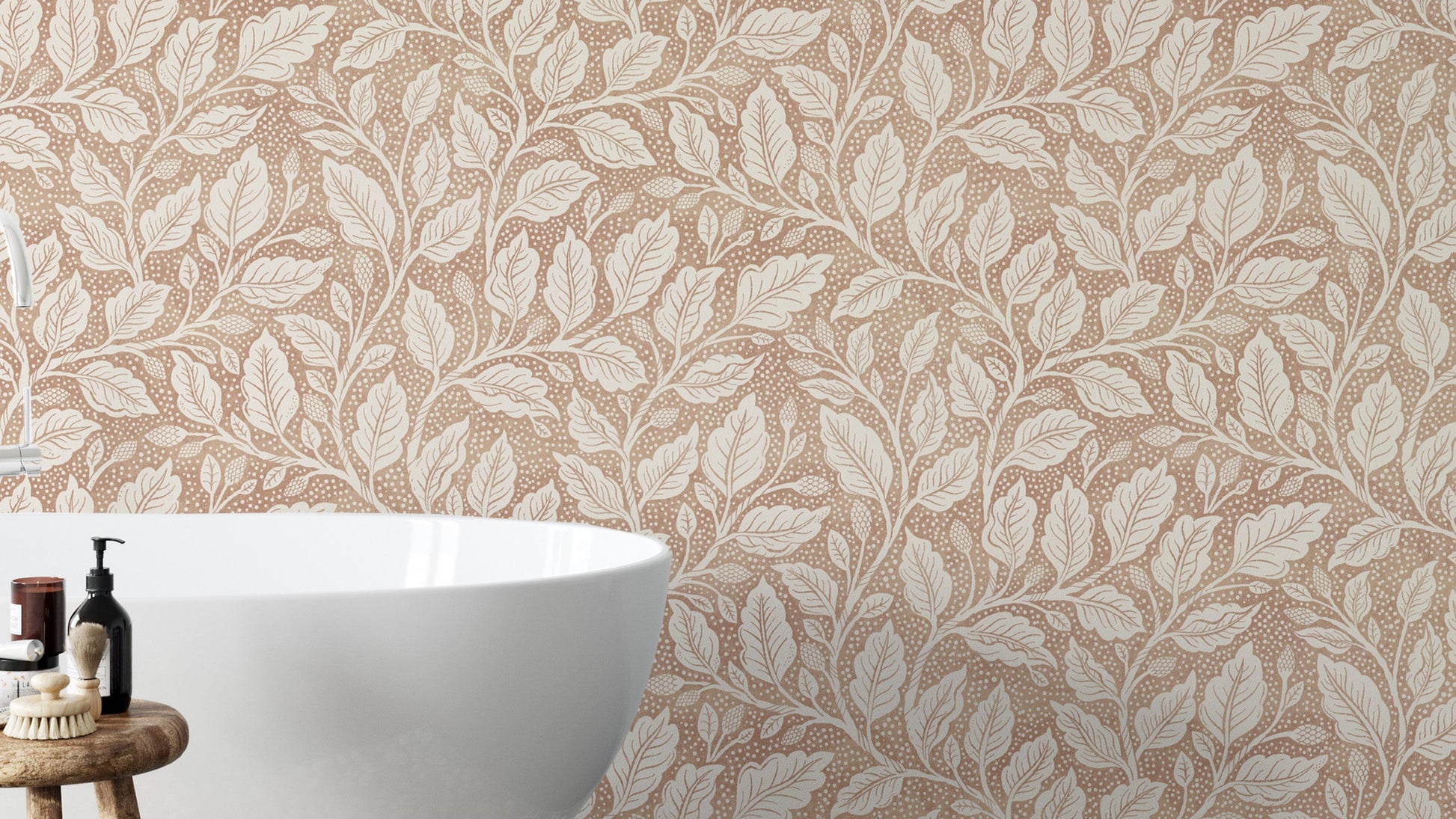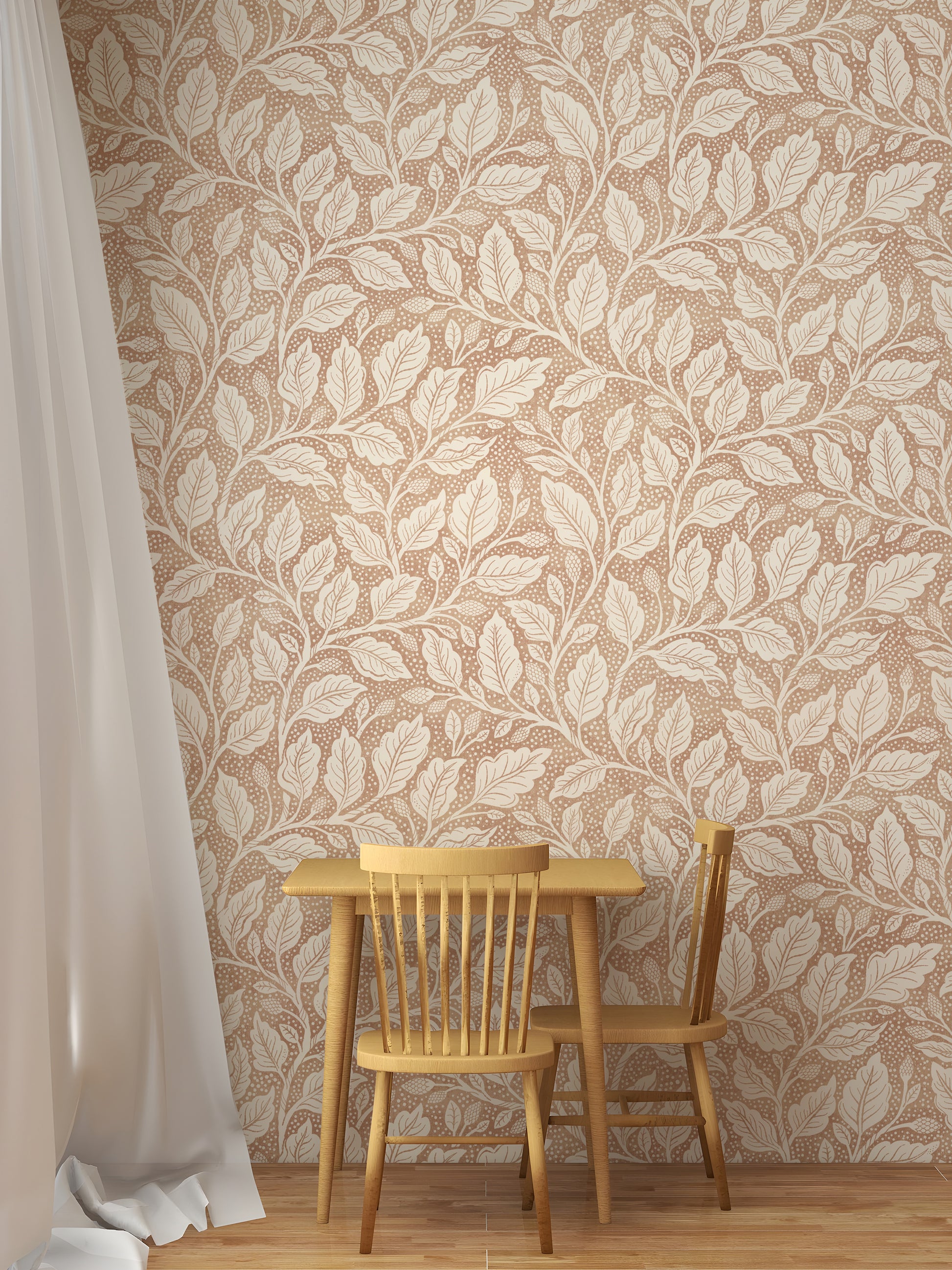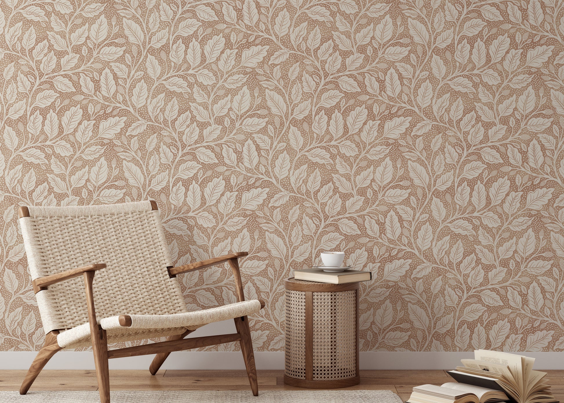 Embrace the subtle elegance of 'Brown Budding Branches,' a digital wallpaper design featuring a captivating interplay of off-white botanical motifs on a textured brown backdrop. Intricate, stylized leaves and budding blossoms create a seamless pattern, reminiscent of vintage botanical illustrations. The delicate off-white branches gracefully intertwine against a speckled, earthy brown ground, evoking a sense of tranquility and natural beauty. Perfect for adding a touch of understated sophistication to any digital device, this wallpaper offers a calming and visually rich experience. The earthy tones and detailed design create a sophisticated yet calming atmosphere.