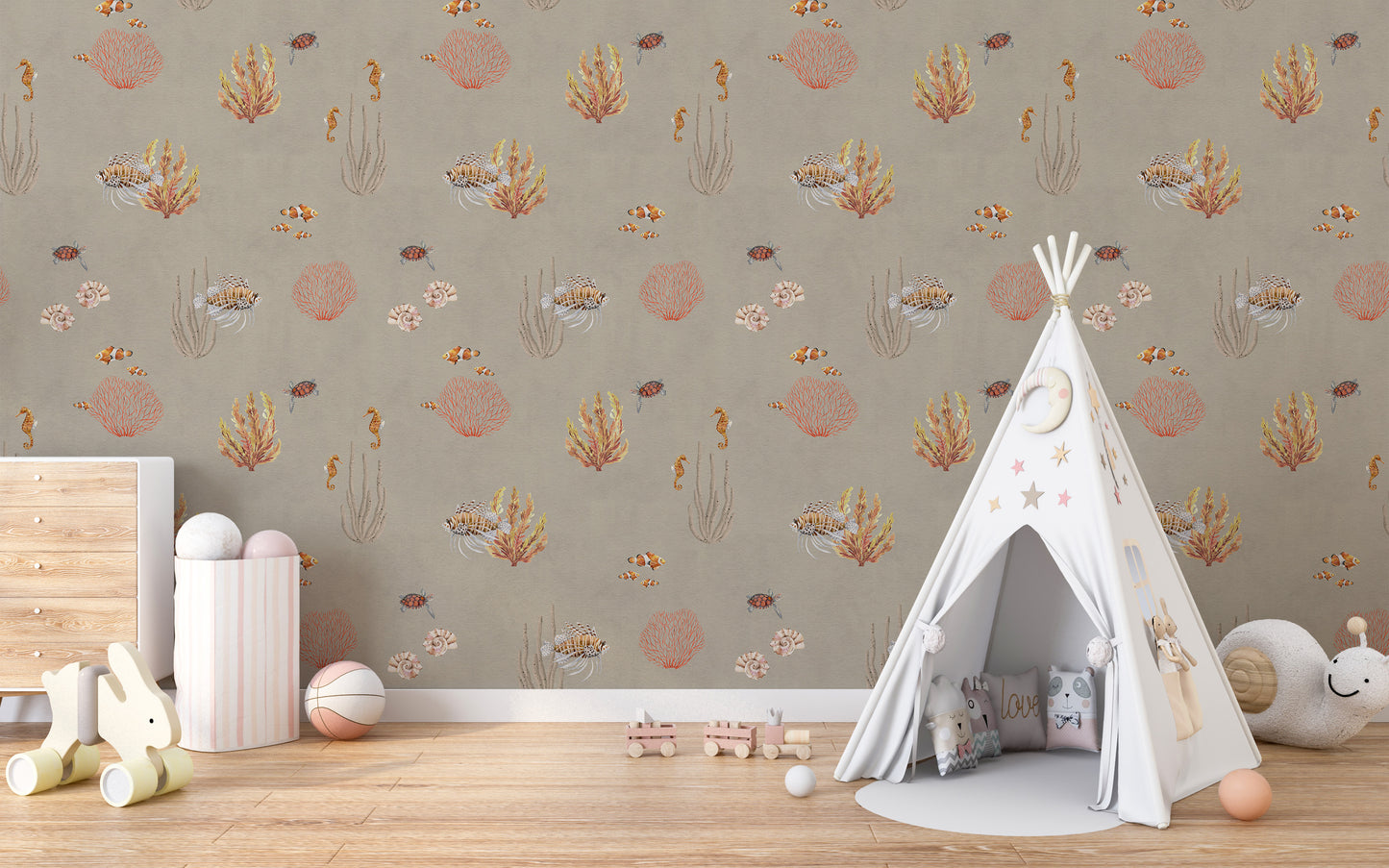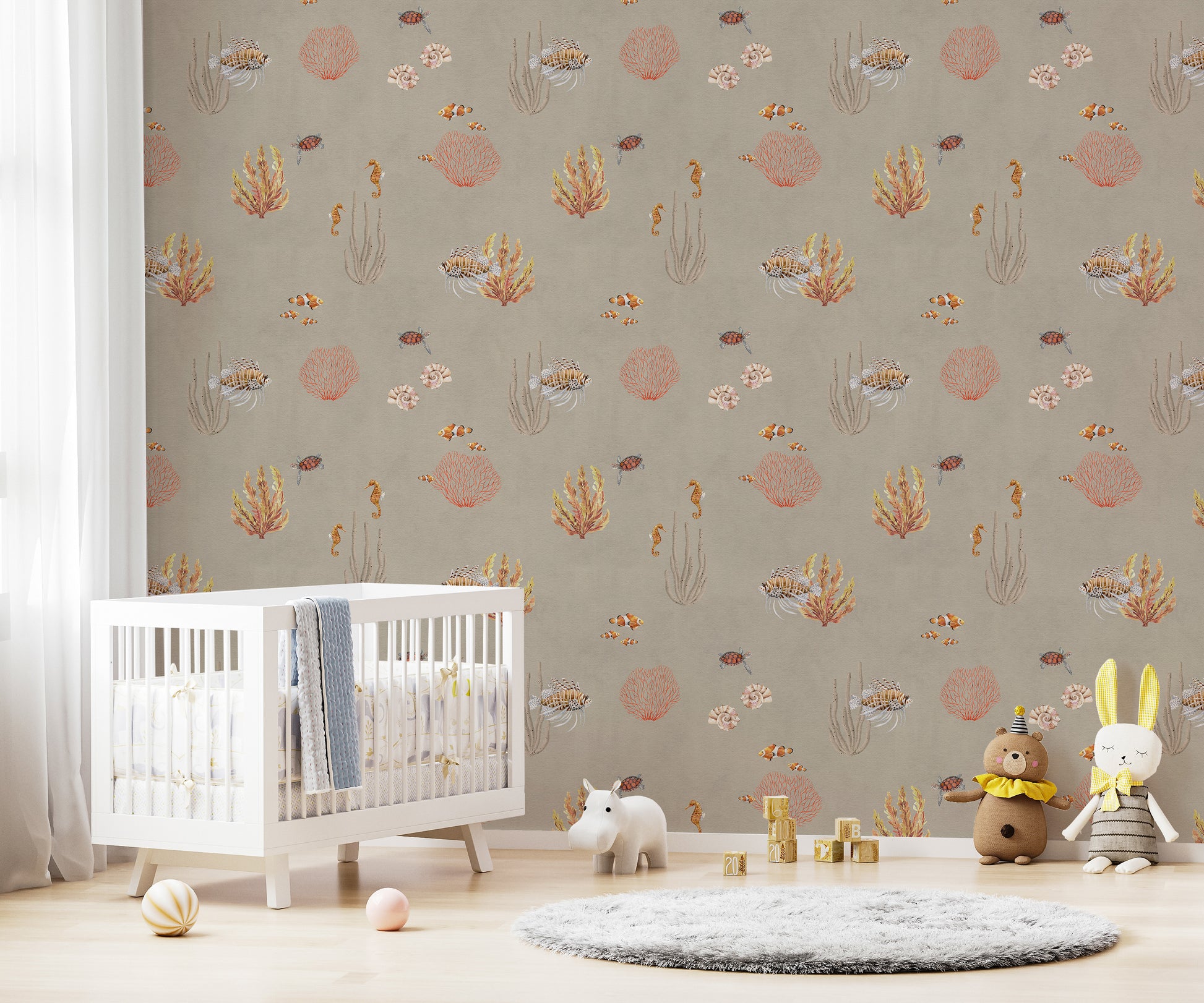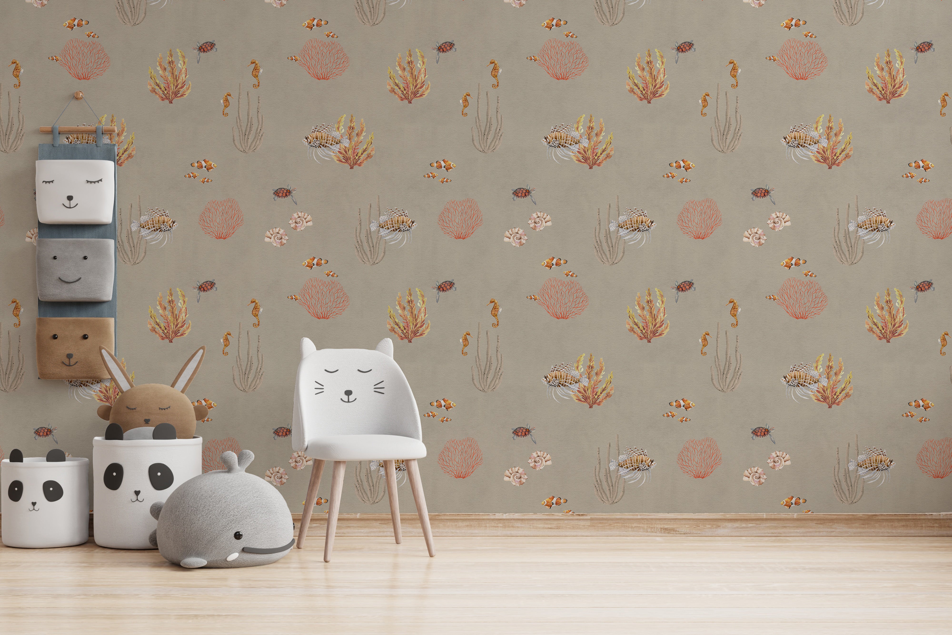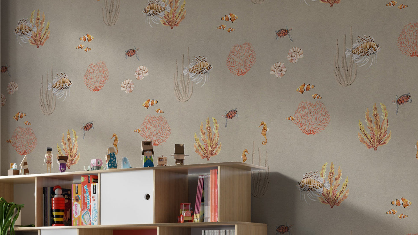 Bring the warmth of the ocean into your space with the Brown Oceanic Wonders Wallpaper Mural. This stunning design captures the beauty of marine life with earthy brown tones, delicate coral reefs, and intricate sea creatures like seahorses, clownfish, and lionfish. The soft, natural hues create a cozy and inviting ambiance, perfect for coastal-inspired decor, beach houses, or ocean lovers. Crafted from high-quality materials, this wallpaper is easy to install and remove, making it a stylish and practical choice for transforming your walls. Let the elegance of the underwater world add depth and charm to your home or office.