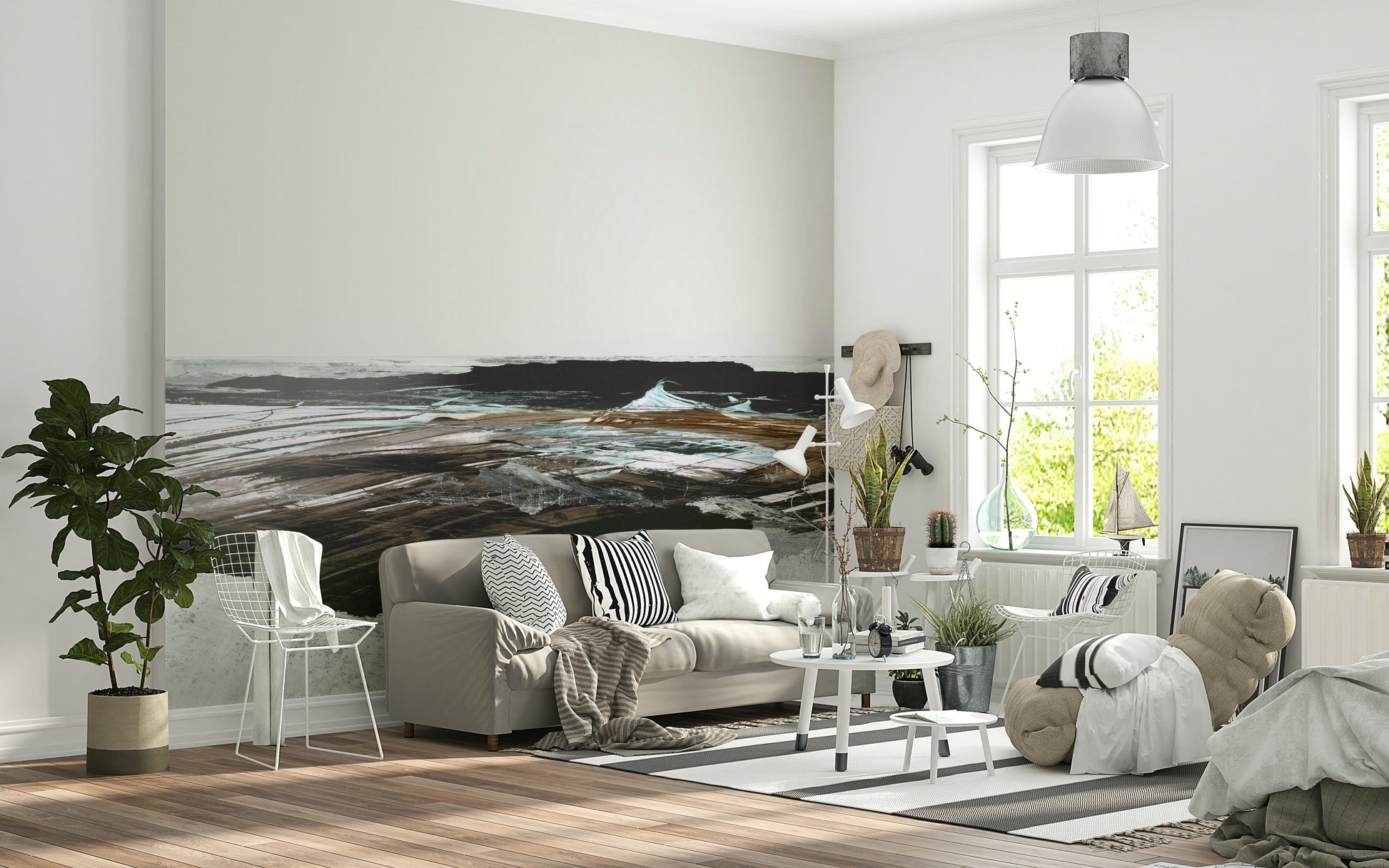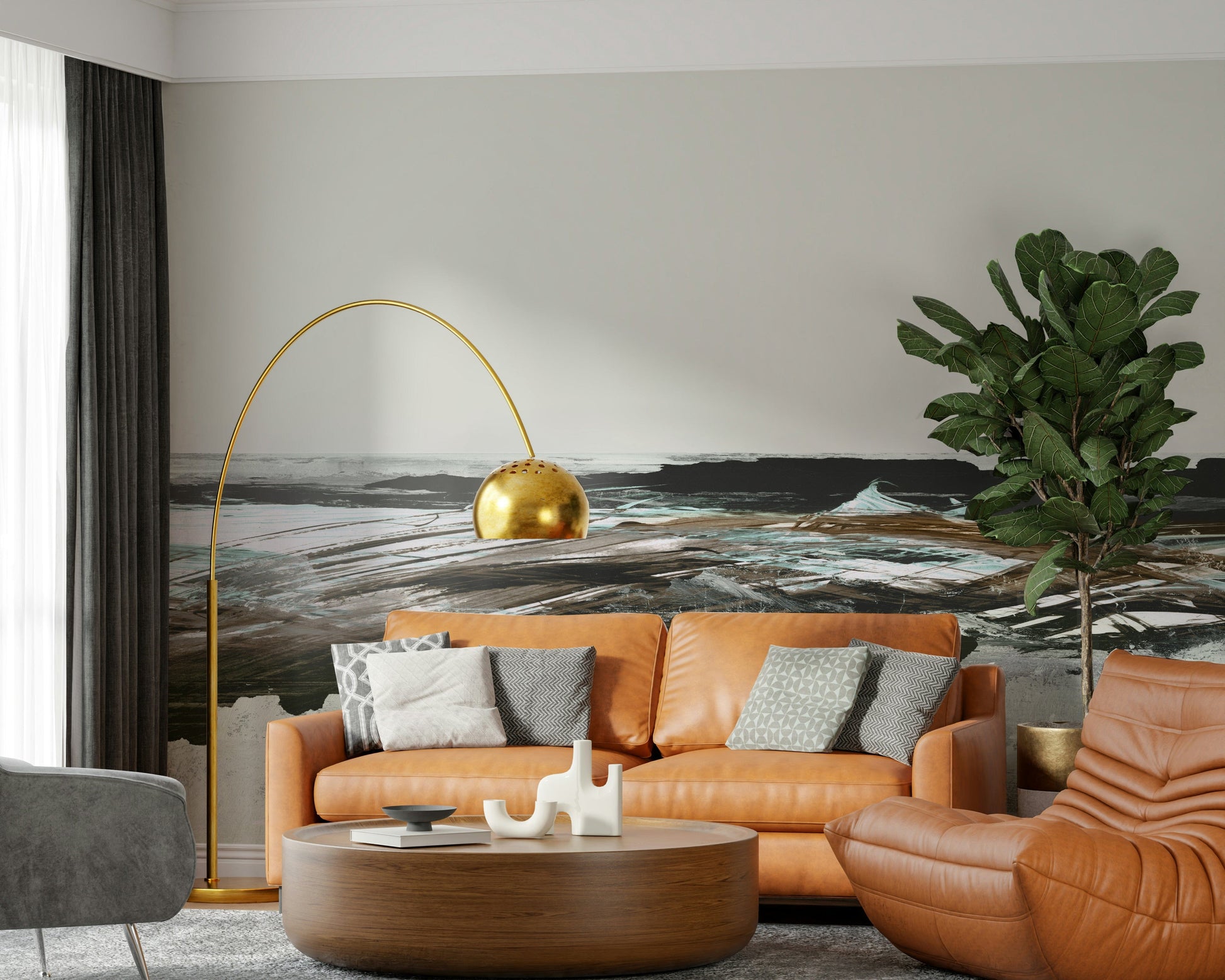 Bring an element of artistic expression to your home with this striking brushstroke design. Bold, sweeping strokes create a moody abstract landscape in shades of brown, teal and white. The simple colour palette keeps it versatile. Consider this wallpaper for walls in living rooms, bedrooms, or hallways to add character and a touch of drama. It complements minimalist or industrial interiors, balancing clean lines with organic textures. Invite visual interest into your space.
