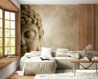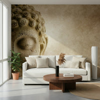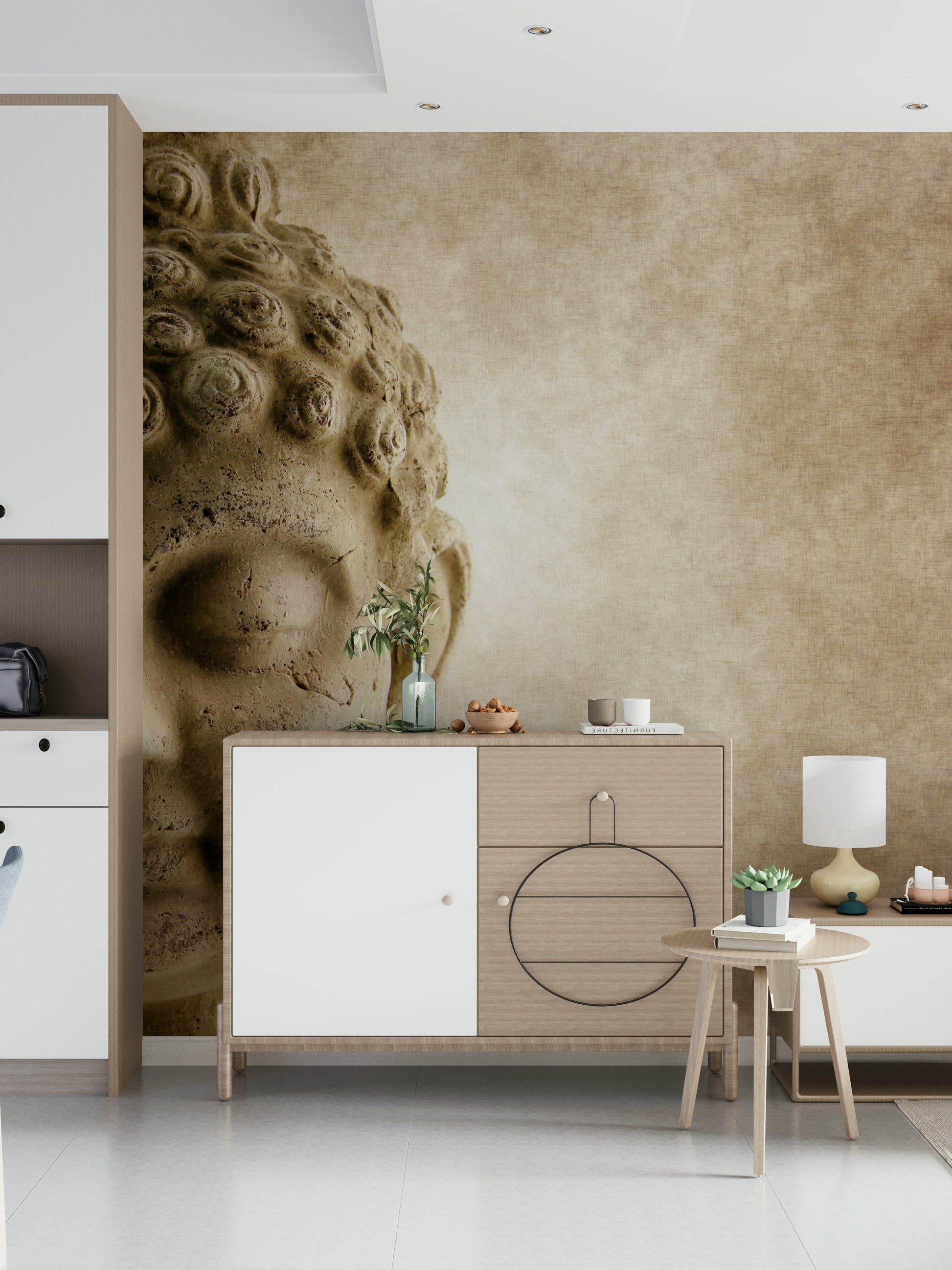 Embrace a sense of inner peace with this elegant Buddha motif. The detailed sculpture against a neutral backdrop brings a touch of spirituality to your home. The aged look offers a vintage vibe. Use this wallpaper for walls to transform your space into a sanctuary. The soft colour scheme complements a variety of interiors, especially those with a minimalist or bohemian style. Ideal for creating a focal point that encourages reflection and serenity.