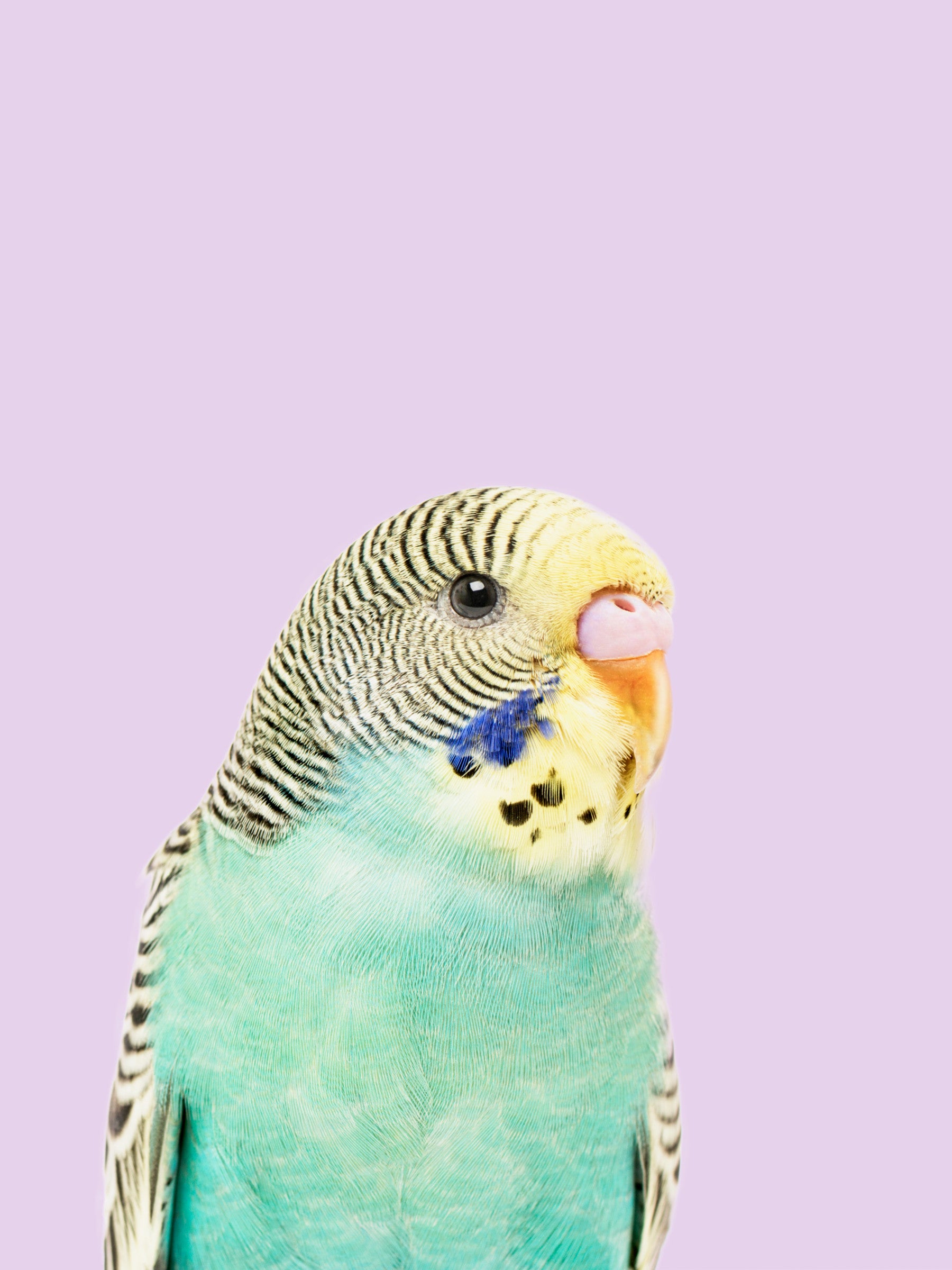 A captivating close-up of a vibrant turquoise budgie against a soft lilac background. Its delicate feathers, showcasing intricate patterns of black and yellow, are beautifully highlighted. The budgie's bright yellow head and charmingly inquisitive gaze create a feeling of gentle curiosity. This minimalist yet striking design brings a touch of playful elegance to any digital device, offering a calming and cheerful aesthetic perfectly embodying the spirit of this beloved pet bird. The pastel color palette and simple composition make this a versatile wallpaper, suitable for a variety of moods and styles.