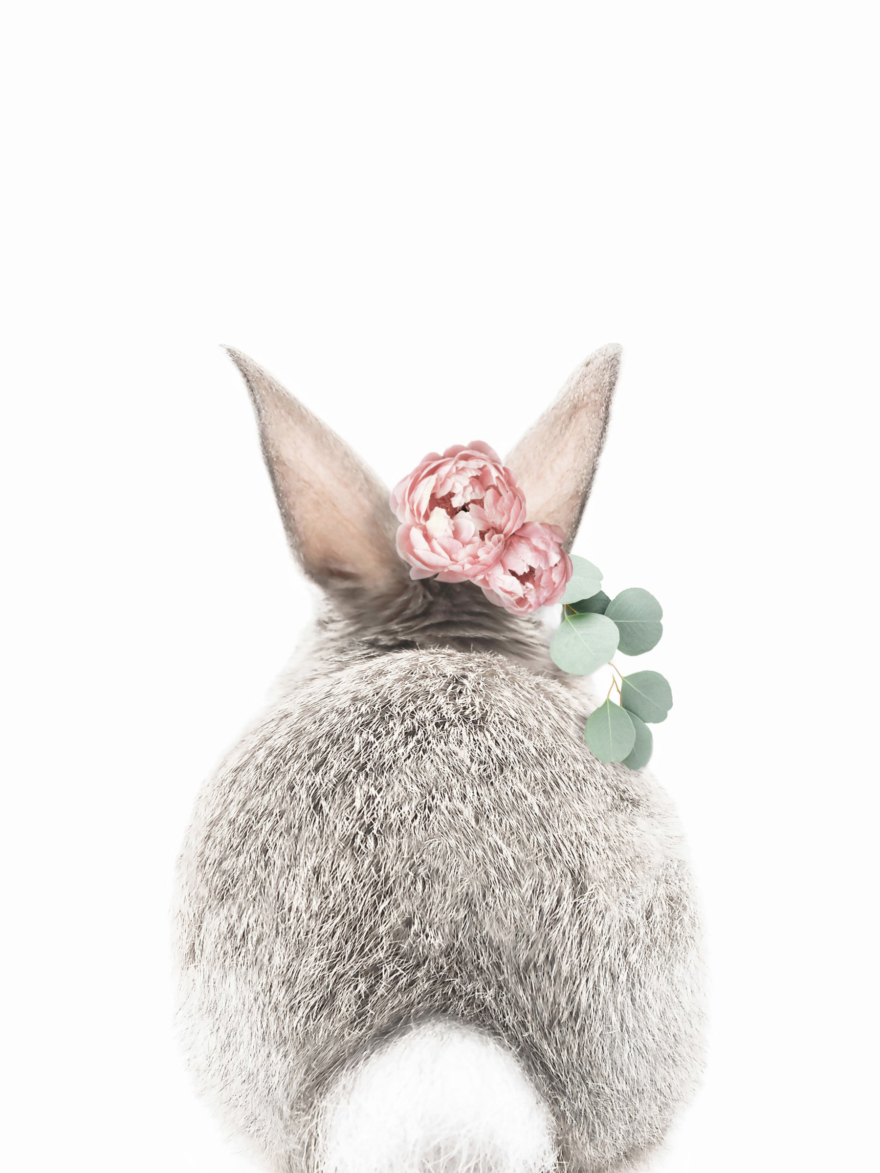 Welcome a gentle charm into your living space with this adorable bunny wallpaper. The design features a fluffy bunny adorned with pink peonies and eucalyptus, creating a serene and sweet atmosphere. The soft grey and pink tones blend seamlessly, making it perfect for a nursery, kids room, or bedroom. This wallpaper for walls introduces a playful yet sophisticated touch, complementing minimalist or Scandinavian interiors. The clear background ensure it blends beautifully with various decor styles.