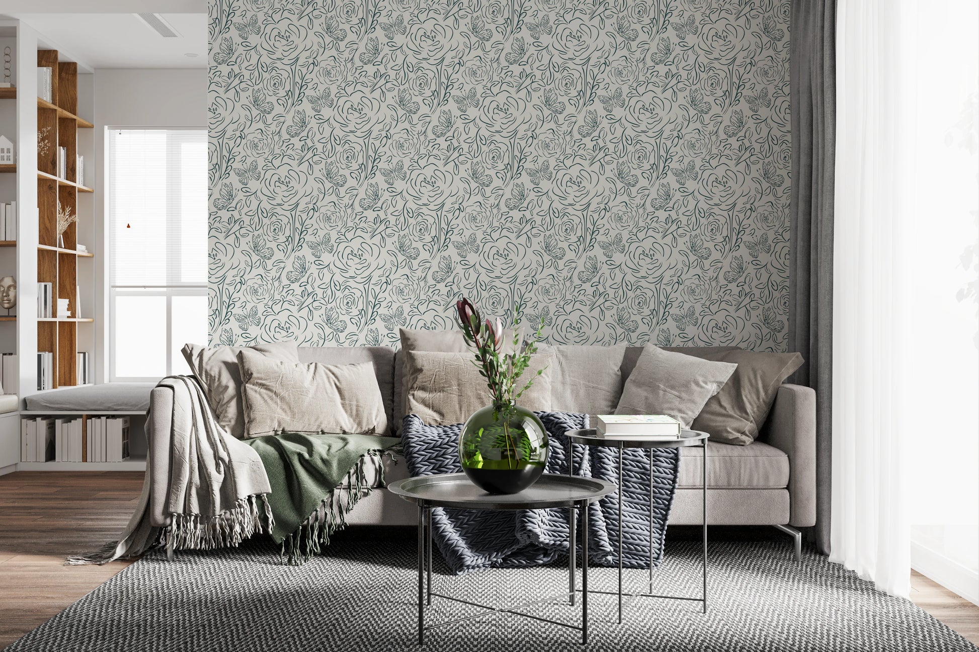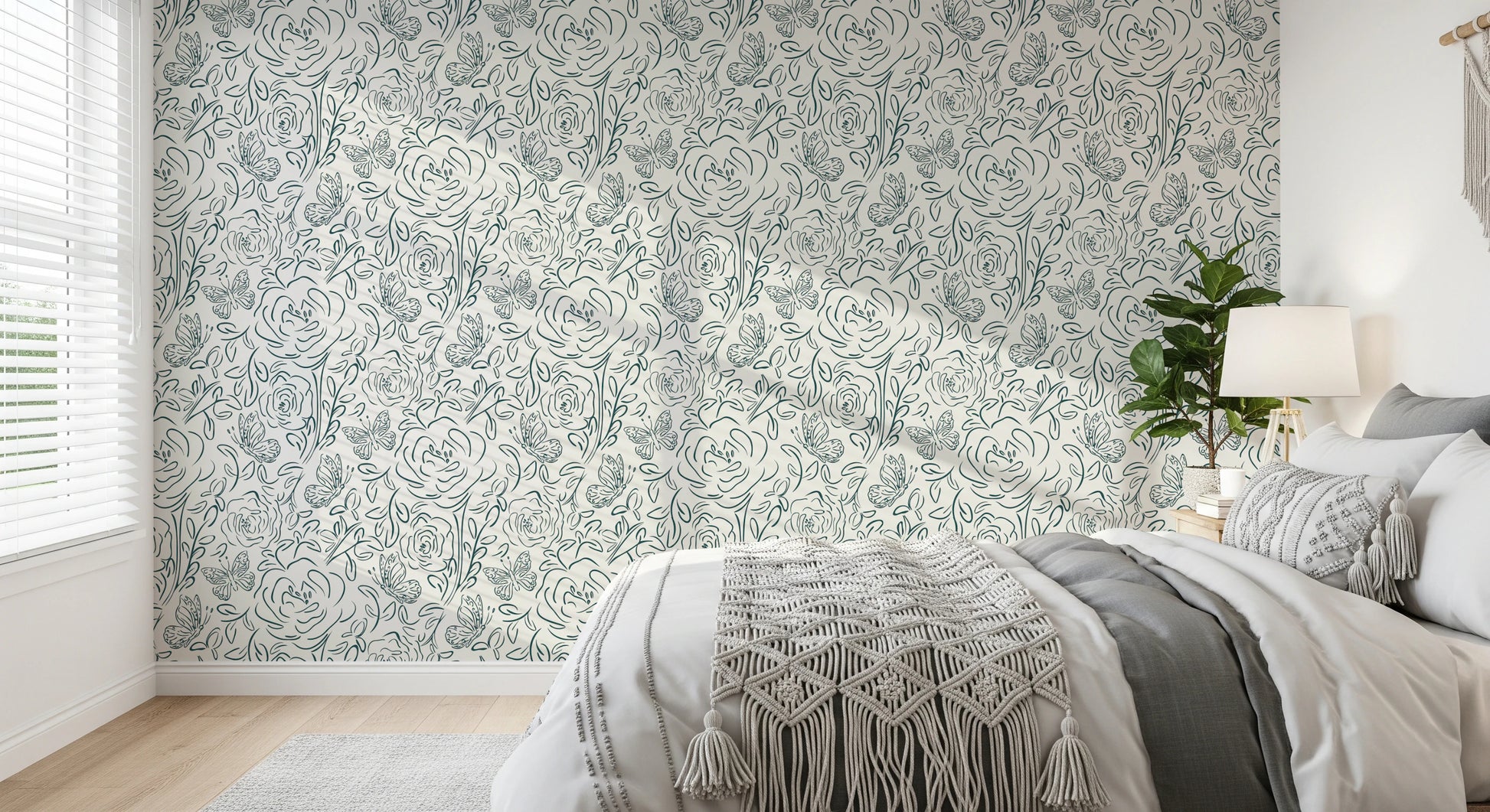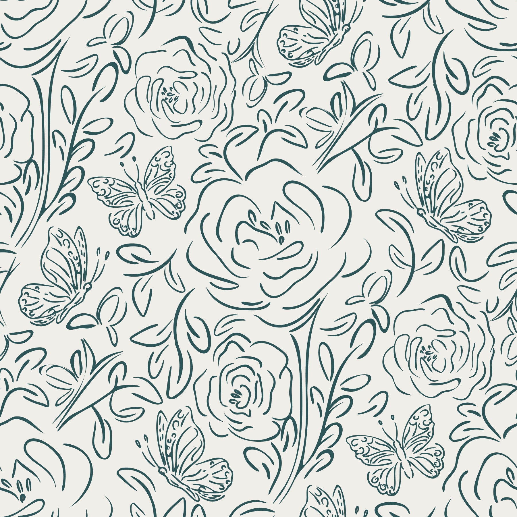 Introduce a touch of simple elegance to your home with this butterfly and floral line-art wallpaper for walls. The delicate, continuous-line design creates a graceful, flowing pattern of roses, leaves, and butterflies. A single green hue against a neutral backdrop allows this pattern to complement any space. This wallpaper brings a calming and sophisticated element to your bedroom, living room, or dining area. The minimalist style enhances your interior without overpowering it. Enjoy the beauty of nature-inspired art that blends seamlessly with modern decor.