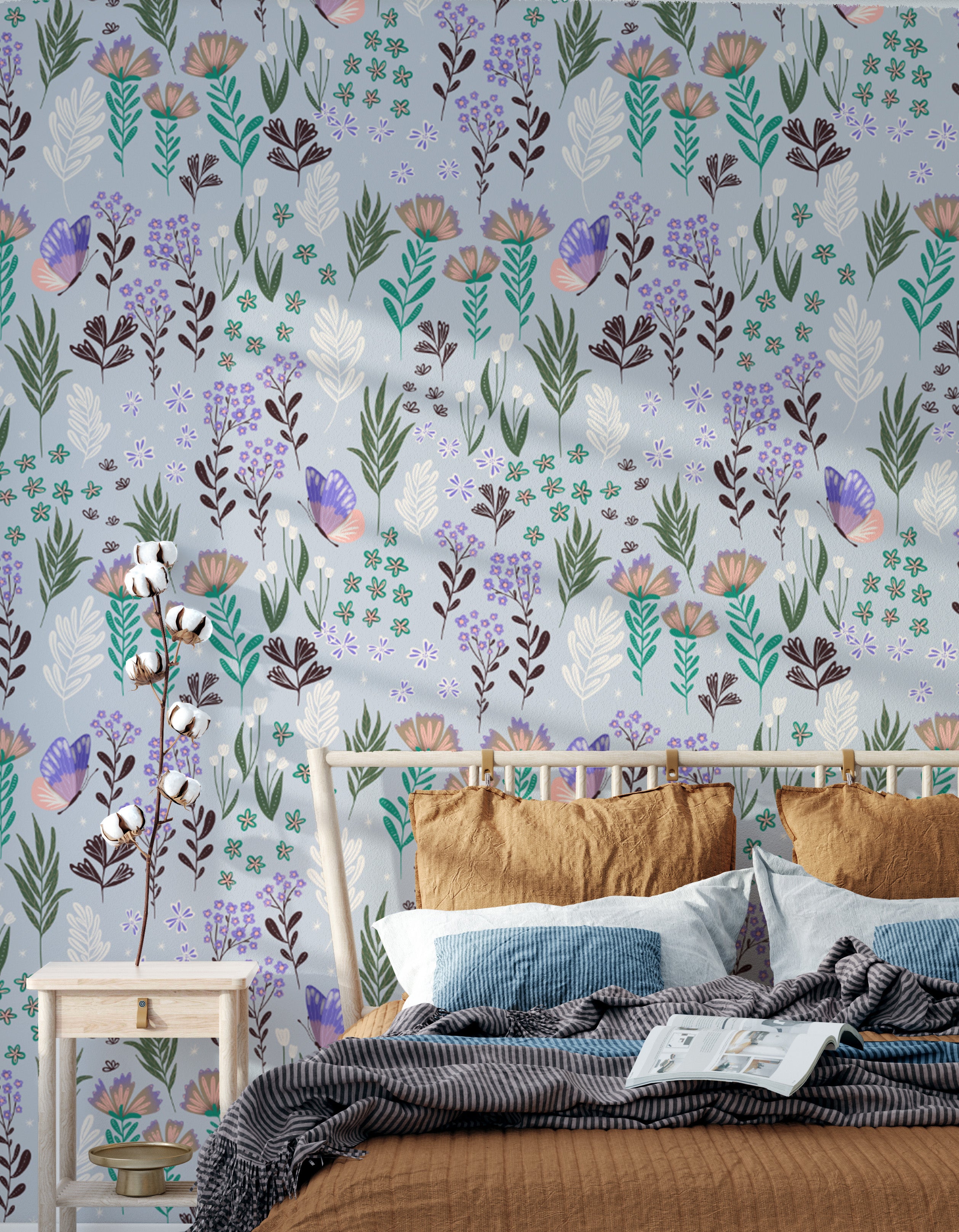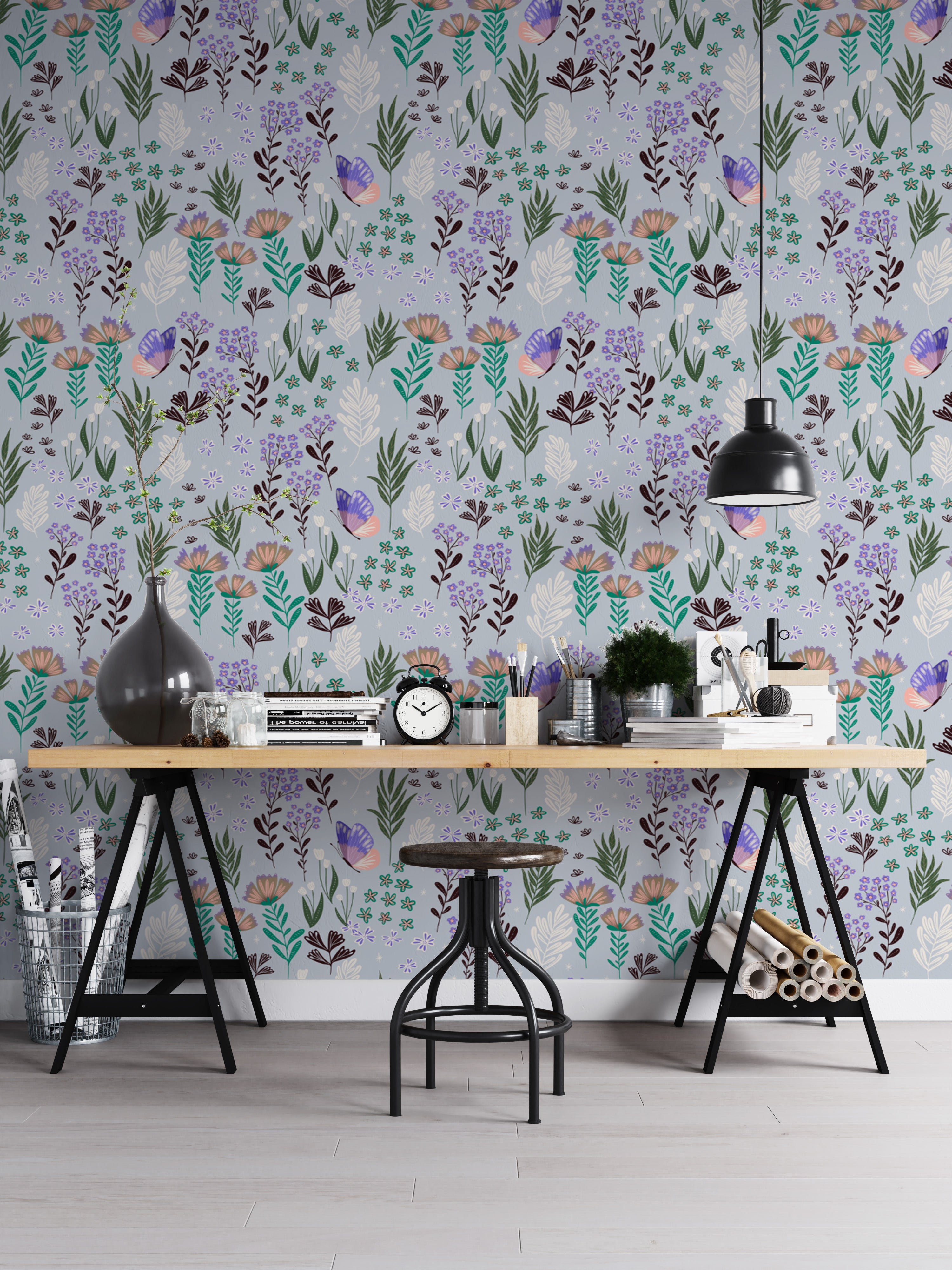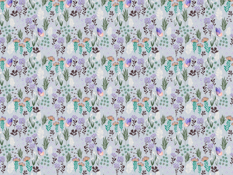 Whimsical butterfly meadow wallpaper with delicate purple accents.