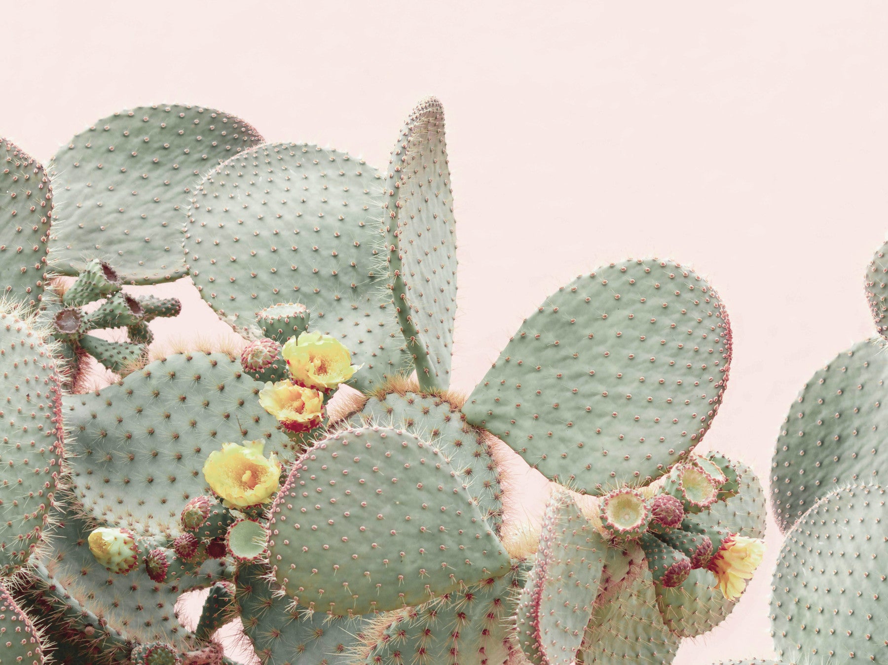Escape to a desert dreamscape with this enchanting wallpaper. Close-up imagery of a prickly pear cactus in soft, muted greens and delicate yellow blooms evokes a feeling of quiet contemplation and natural beauty. The soft blush pink background enhances the overall sense of tranquility and warmth, creating a soothing atmosphere ideal for bedrooms or meditation spaces. The subtle textures and refined color palette make this wallpaper a versatile choice for contemporary and bohemian interiors, adding a touch of desert elegance to any room.