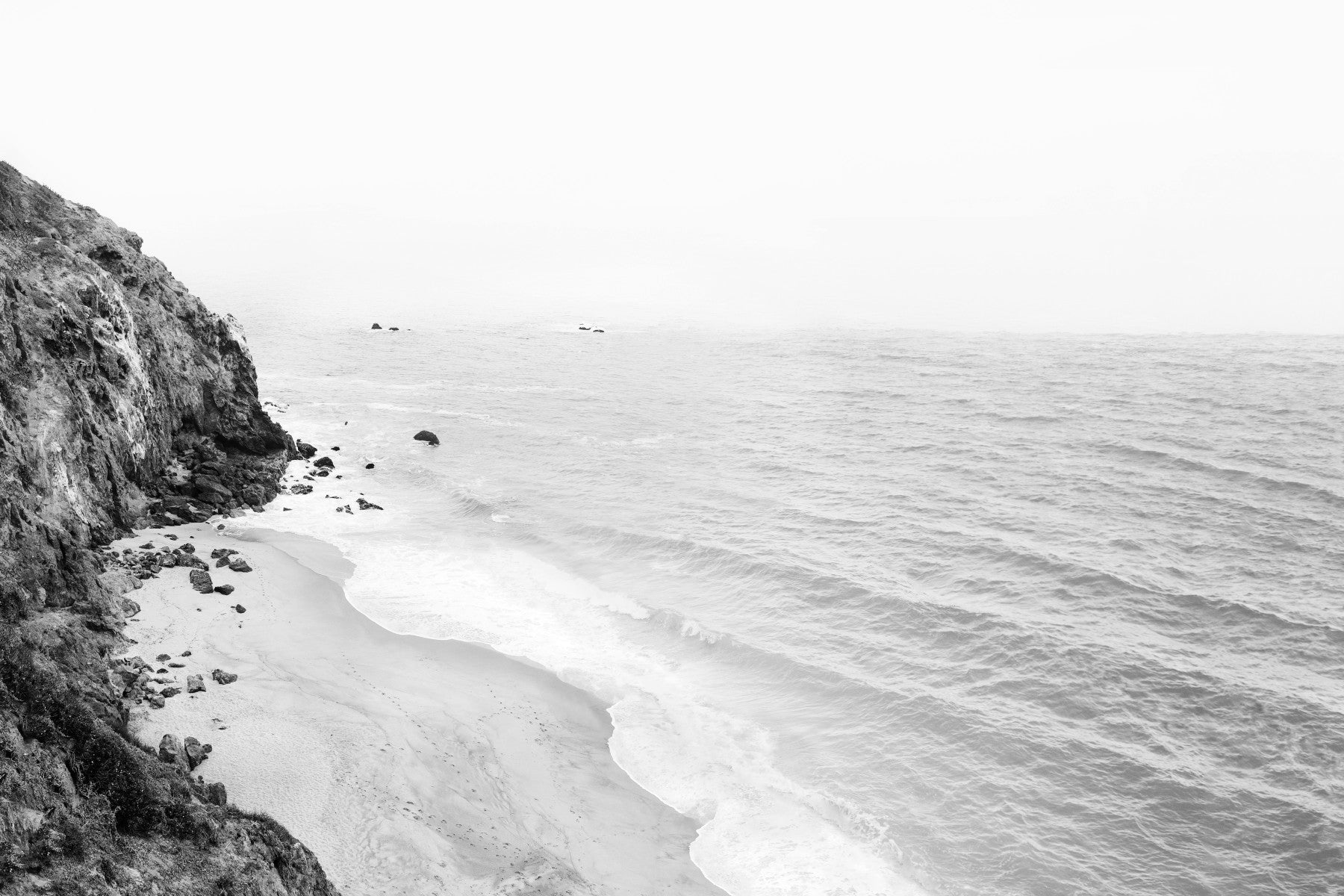 A breathtaking monochrome landscape capturing the serene beauty of the California coast. The image showcases a dramatic cliff face descending to a secluded, sandy beach where gentle waves caress the shore. The vast, misty ocean stretches to the horizon, creating a sense of calm and mystery. The black and white palette enhances the textural contrast between the rugged cliffs, the soft sand, and the undulating ocean, evoking a timeless and elegant mood. Perfect for those seeking a tranquil and sophisticated desktop background.