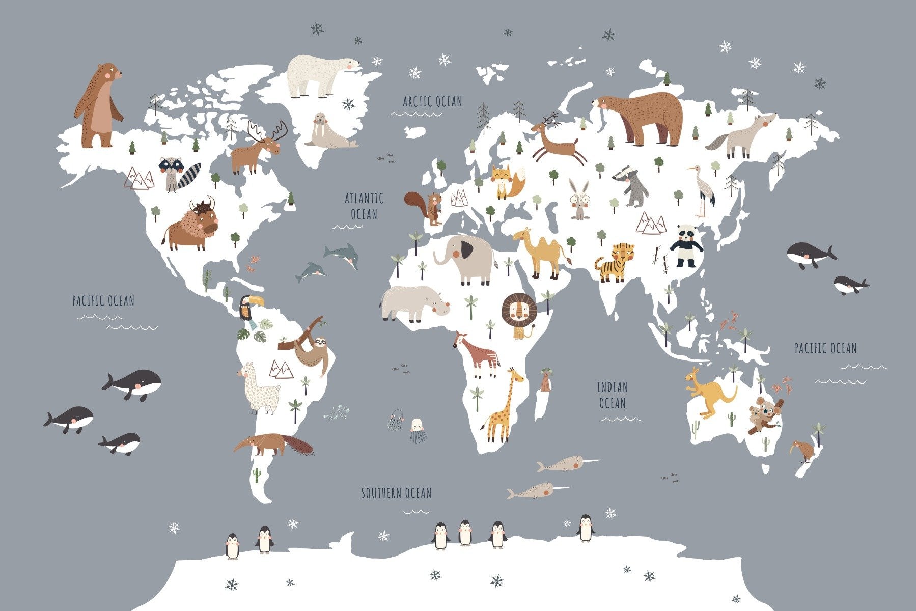 Brighten up your child's room with our Kids World Map & Cartoon Animals Wallpaper Mural! This charming world map wallpaper transforms any nursery or playroom into a vibrant, educational space. Each continent is artfully adorned with adorable cartoon animals, engaging young minds in geography and wildlife. The cool gray background offers a calm yet stimulating backdrop, making it a versatile fit for any room decor. Our cartoon animal wallpaper is easy to install, with high-quality, durable material ensuring longevity. It's an excellent way to add a touch of whimsy while fostering a love for learning. Ideal for sparking curiosity and imagination, this gray wallpaper mural is a must-have for any young explorer's room.