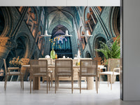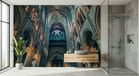 Bring timeless elegance to your home with this architectural wallpaper. This stunning wallpaper for walls showcases the interior of a grand cathedral, with impressive arches reaching towards the heavens. The design features a muted colour palette of greys, whites, and blues, accented by the warm glow of chandeliers. This sophisticated wall décor adds depth and grandeur to any room, creating an atmosphere of serenity and reverence. Ideal for a living room, bedroom, or entryway. It pairs nicely with minimalist furniture, ornate décor, and soft lighting.