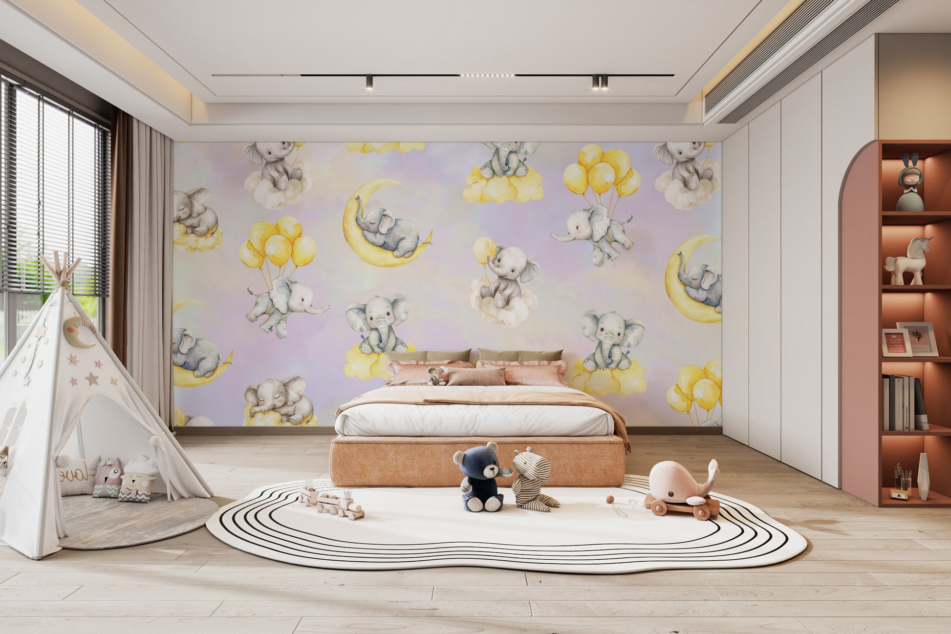 Create a dreamy haven for your baby with Celestial Cradles Elephant Wallpaper, an enchanting children's wallpaper featuring adorable little elephants floating on whimsical clouds and crescent moons surrounded by a palette of soft pastels that speak of fairy tales. Perfect for nursery or playroom it carries with it a shadow of whimsical charm sure to inspire imagination and soothe the senses. Made from high quality eco-friendly materials, this wallpaper is safe, durable, and easy to apply-, perfect for busy parents. Turn your child's room into an ethereal fairy-nook, charming and magical. Let this fabulous kids wallpaper sprinkle some peace and playfulness into your home.