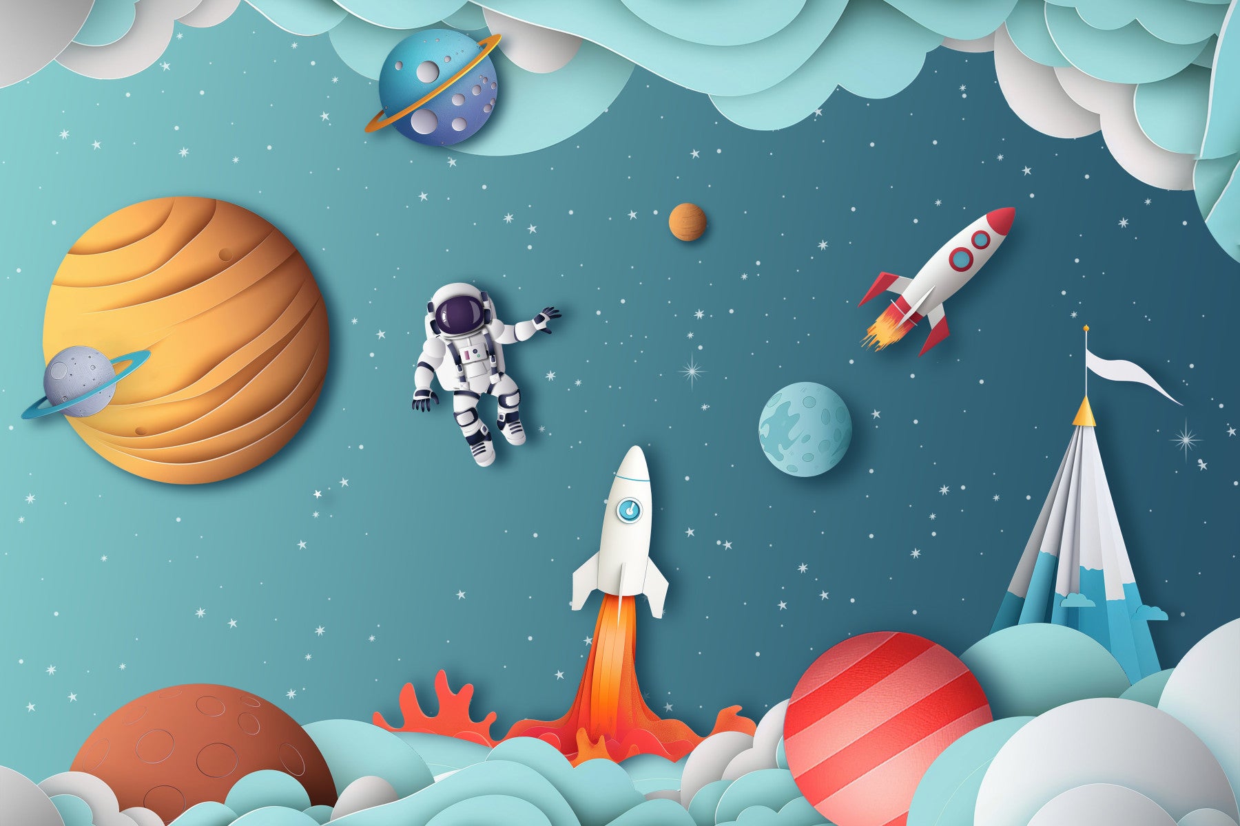 Set course for the stars with this charming space exploration wallpaper for walls. This design features stylized planets, a floating astronaut, and dynamic rockets in a cheerful, paper-cut style. Soft blues and reds create a playful yet calming effect. Decorate a nursery or a kid’s bedroom with this whimsical scene and watch their imagination take flight. The design fosters a sense of wonder and perfectly complements creative and joyful interiors.