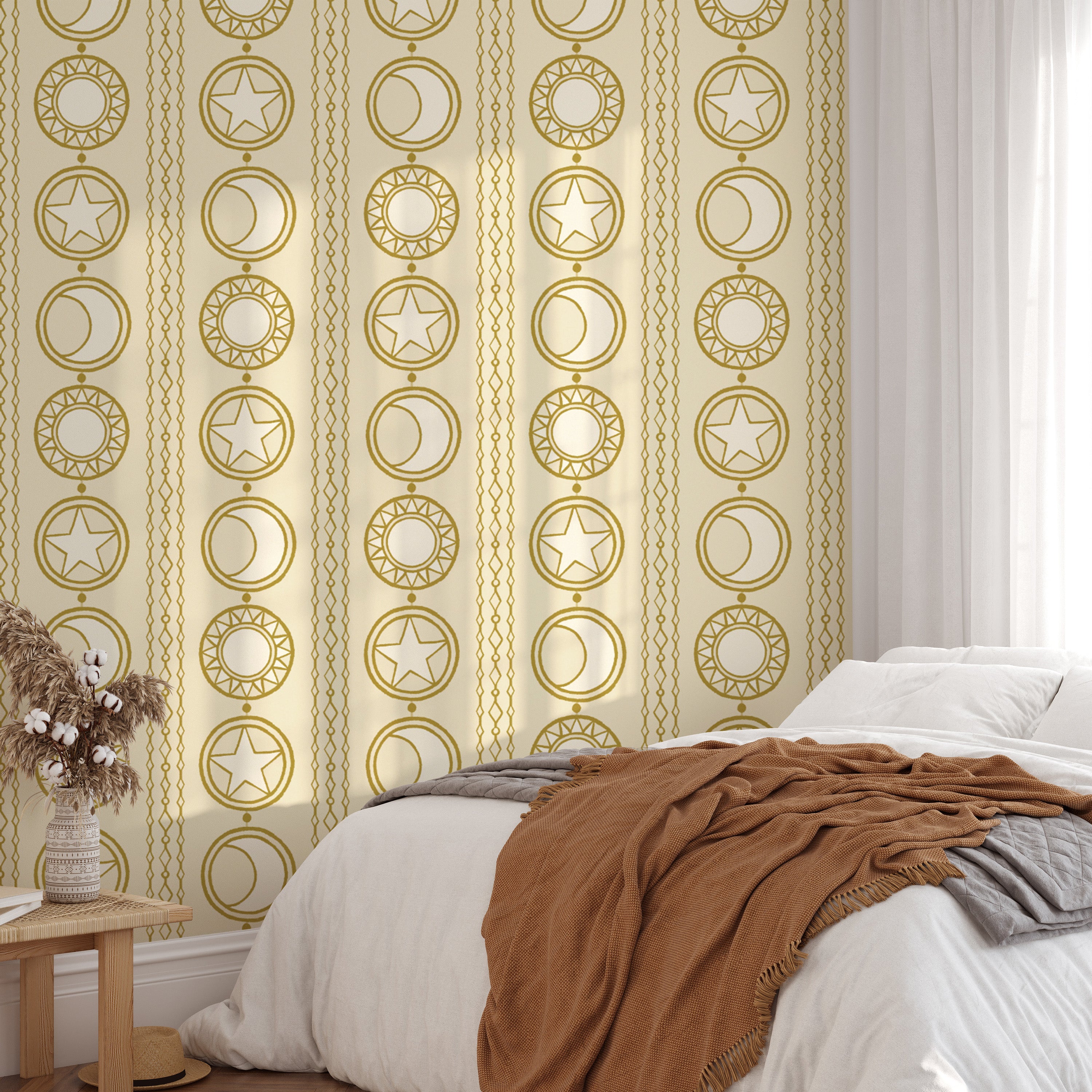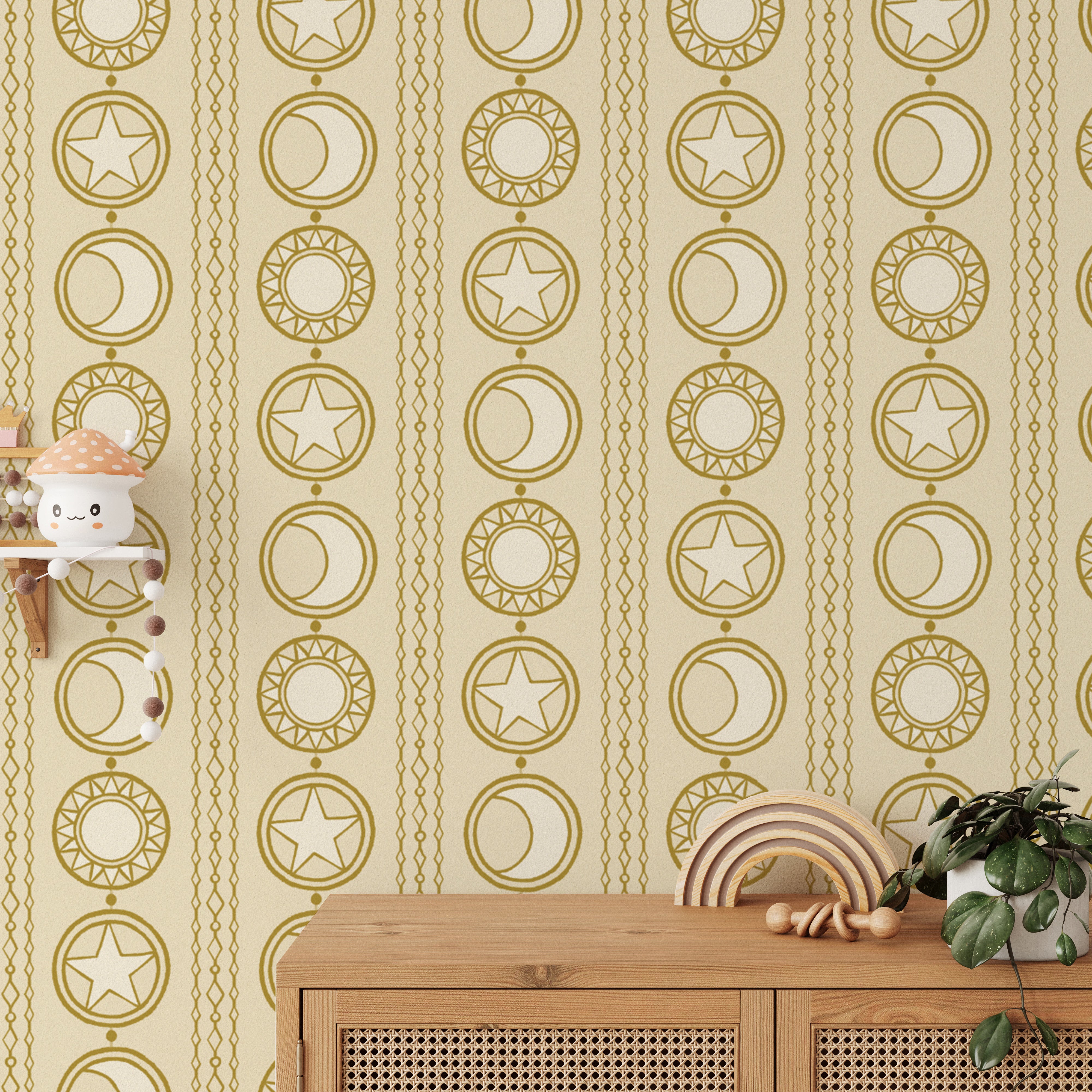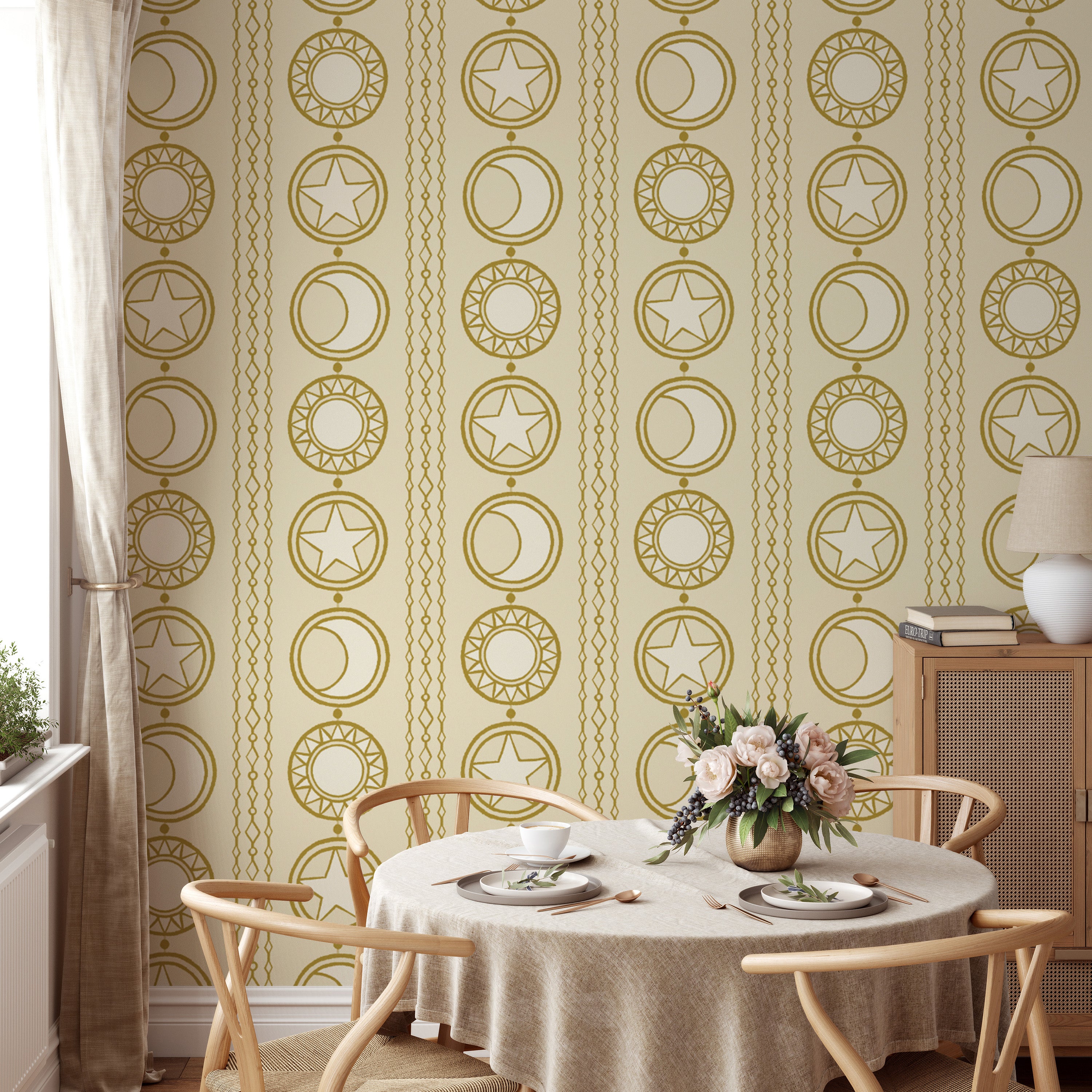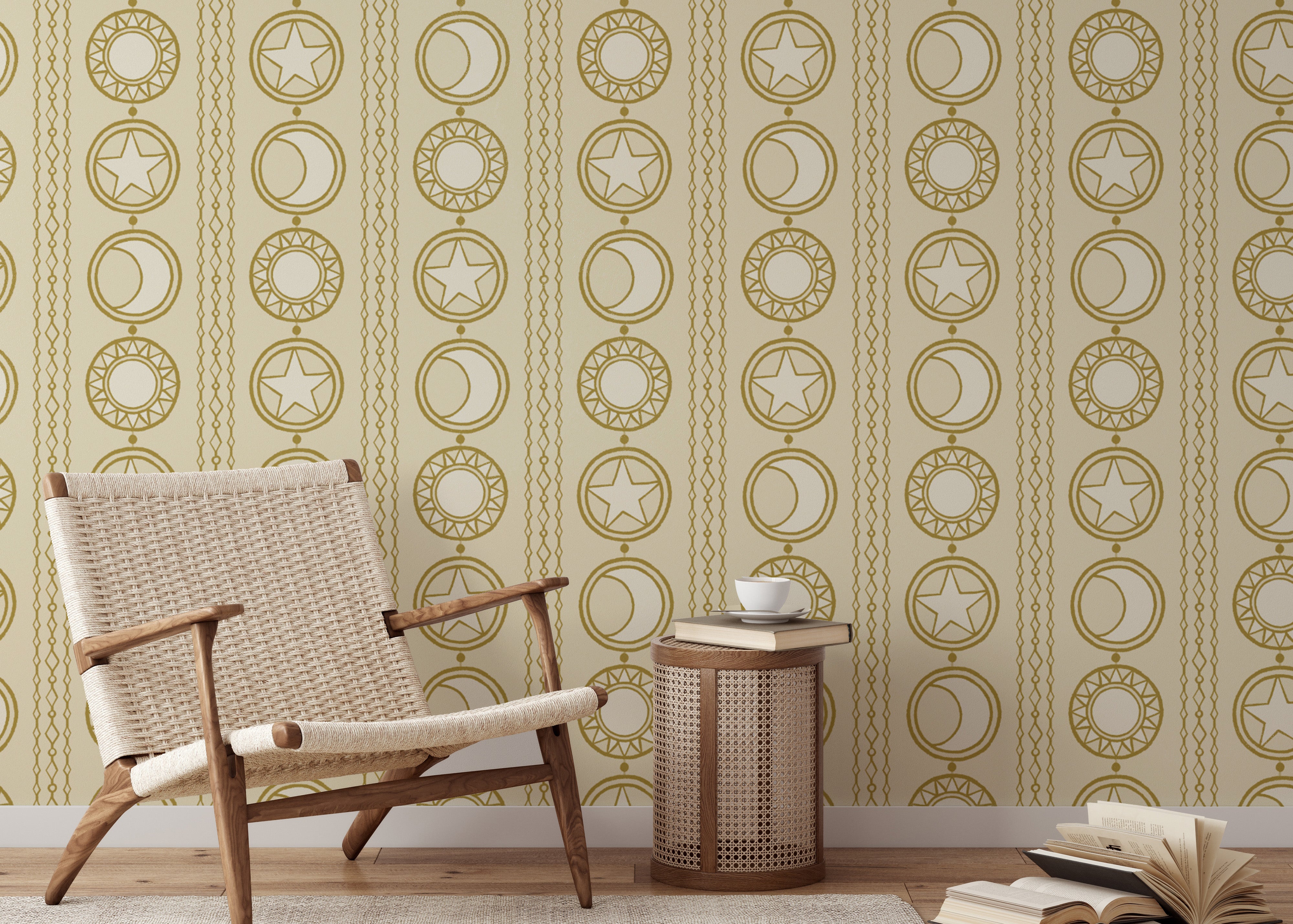 Artistic celestial medallions wallpaper for a modern celestial vibe.
