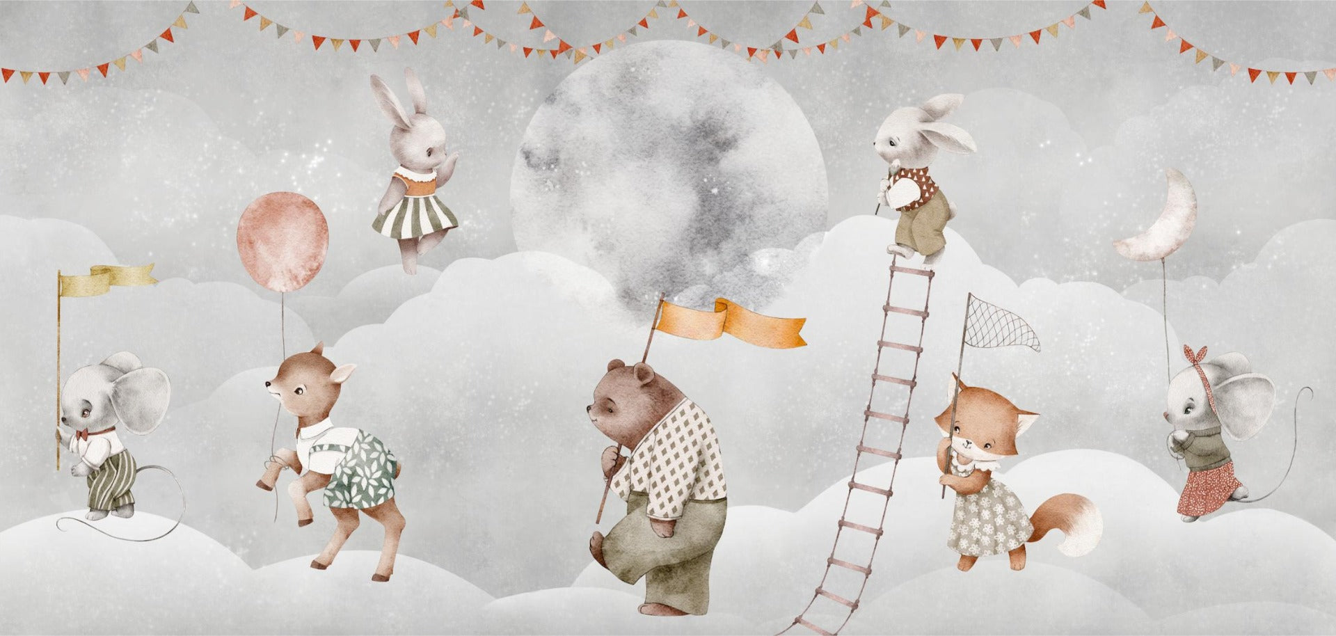 Embark on a sky-high journey with our celestial nursery adventure mural. Gaze into a gentle realm where playful animals dance amongst fluffy clouds, encapsulated by a vast, dreamy sky. This clouds and sky wallpaper mural invites a whisper of whimsy and a dash of wonder to any room, crafting a storybook atmosphere. Let the soft tones and peaceful imagery create a soothing backdrop for imagination to take flight.