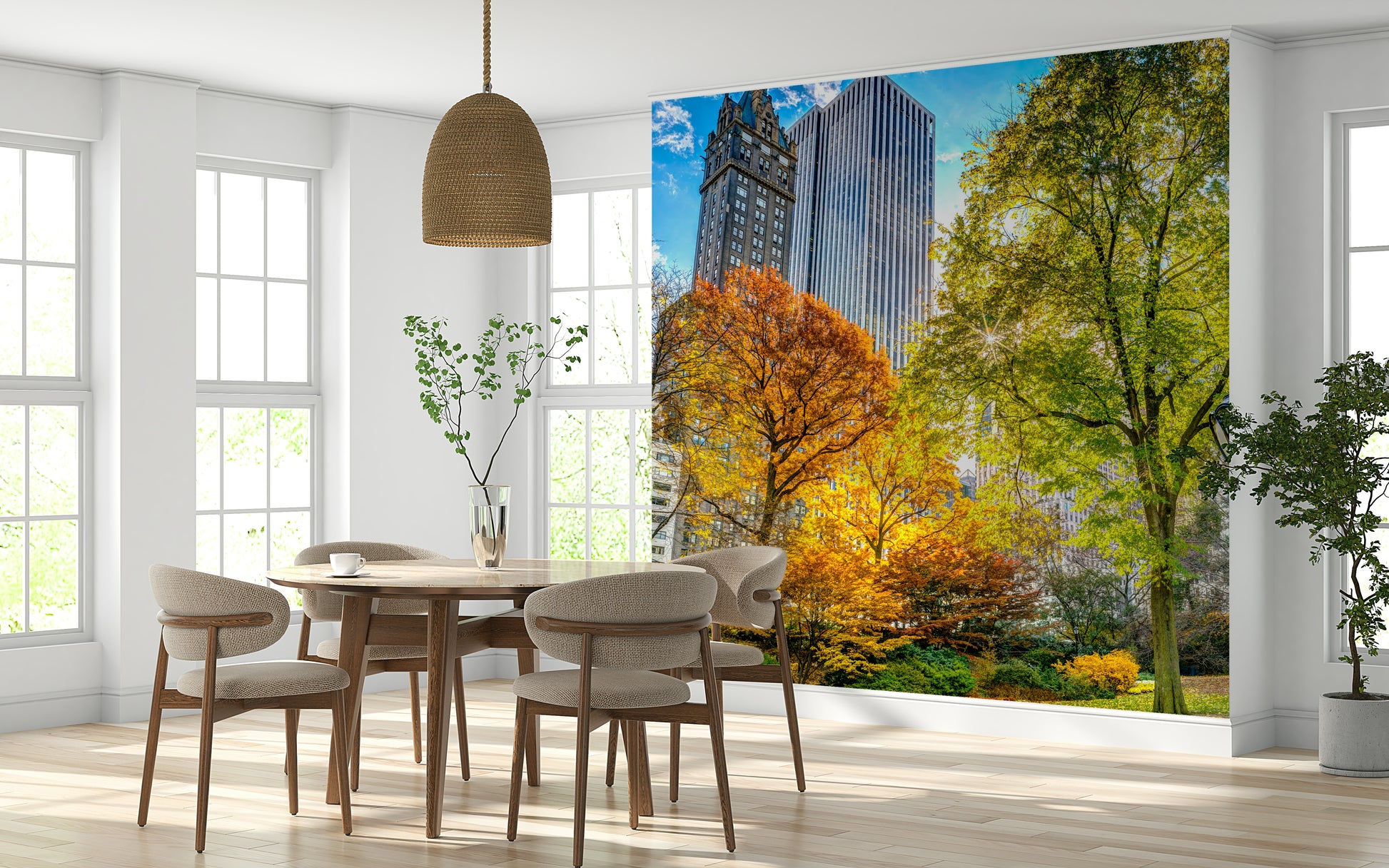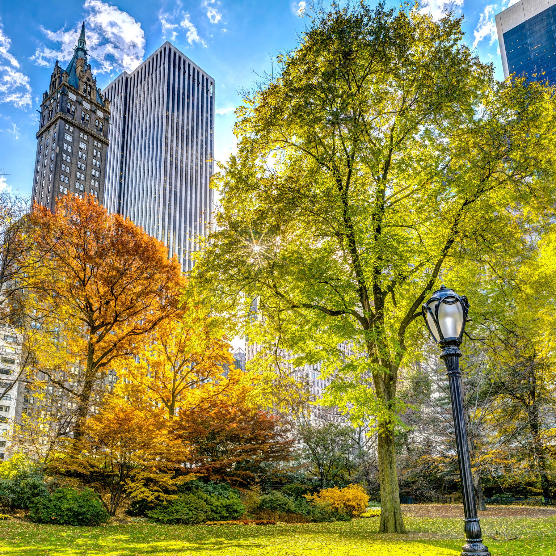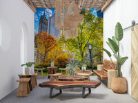 Central Park in autumn, Manhattan, New York. Immerse yourself in the breathtaking beauty of autumn with this stunning Central Park wallpaper. The image captures the essence of fall, showcasing a vibrant tapestry of colours as the leaves transition to fiery reds, warm oranges, and golden yellows. Classic New York architecture punctuates the background adding a urban contrast to the serene nature scene. Sunlight streams through the canopy creating a magical atmosphere. The gentle light reflects on the ground, painting a vibrant scene, alongside a classic black lamppost. This wallpaper perfectly encapsulates the tranquil ambiance of Central Park during its most colourful season, bringing a touch of nature's artistry to your digital space.