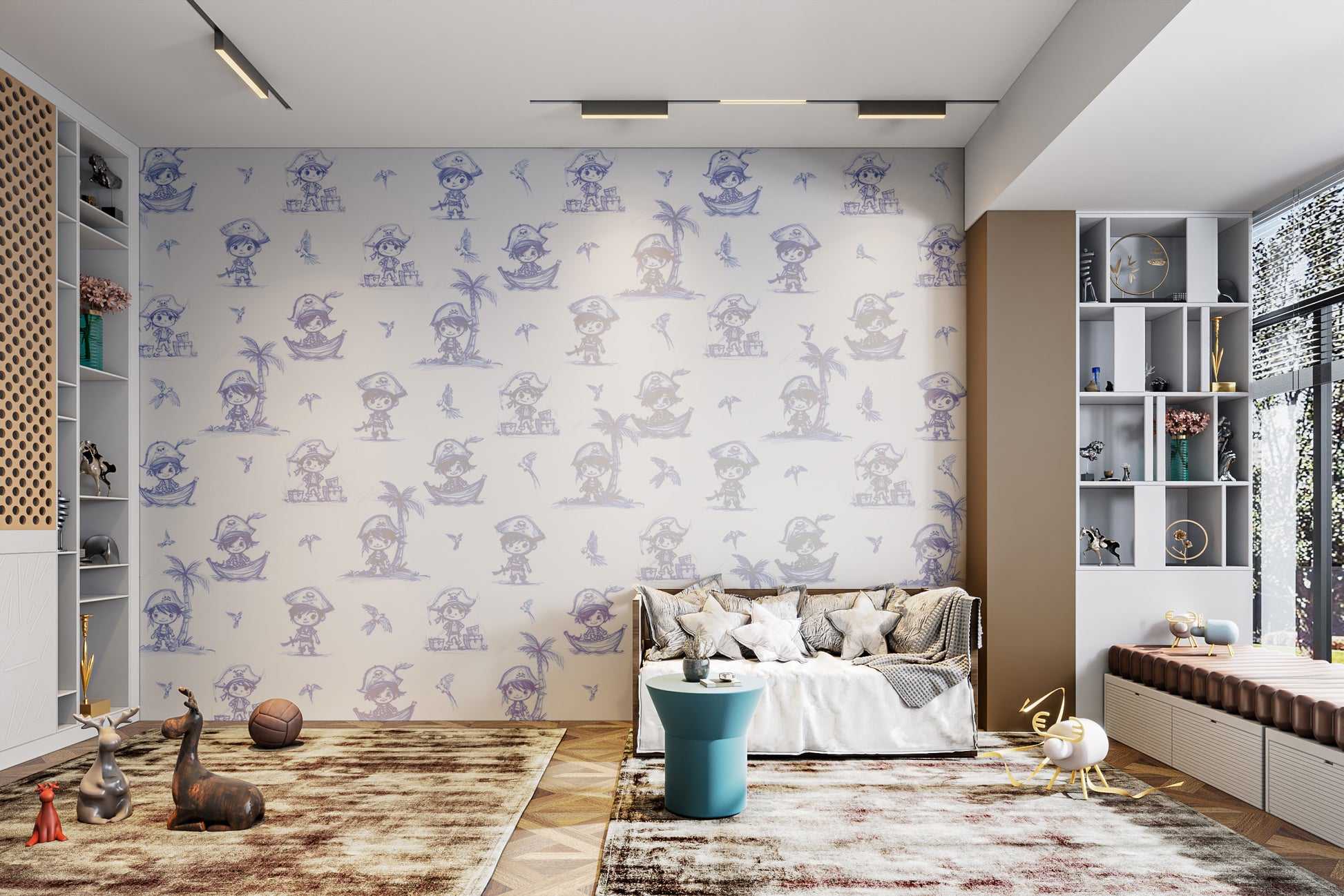 Illustrated pirate wallpaper perfect for adventurous kids' spaces.