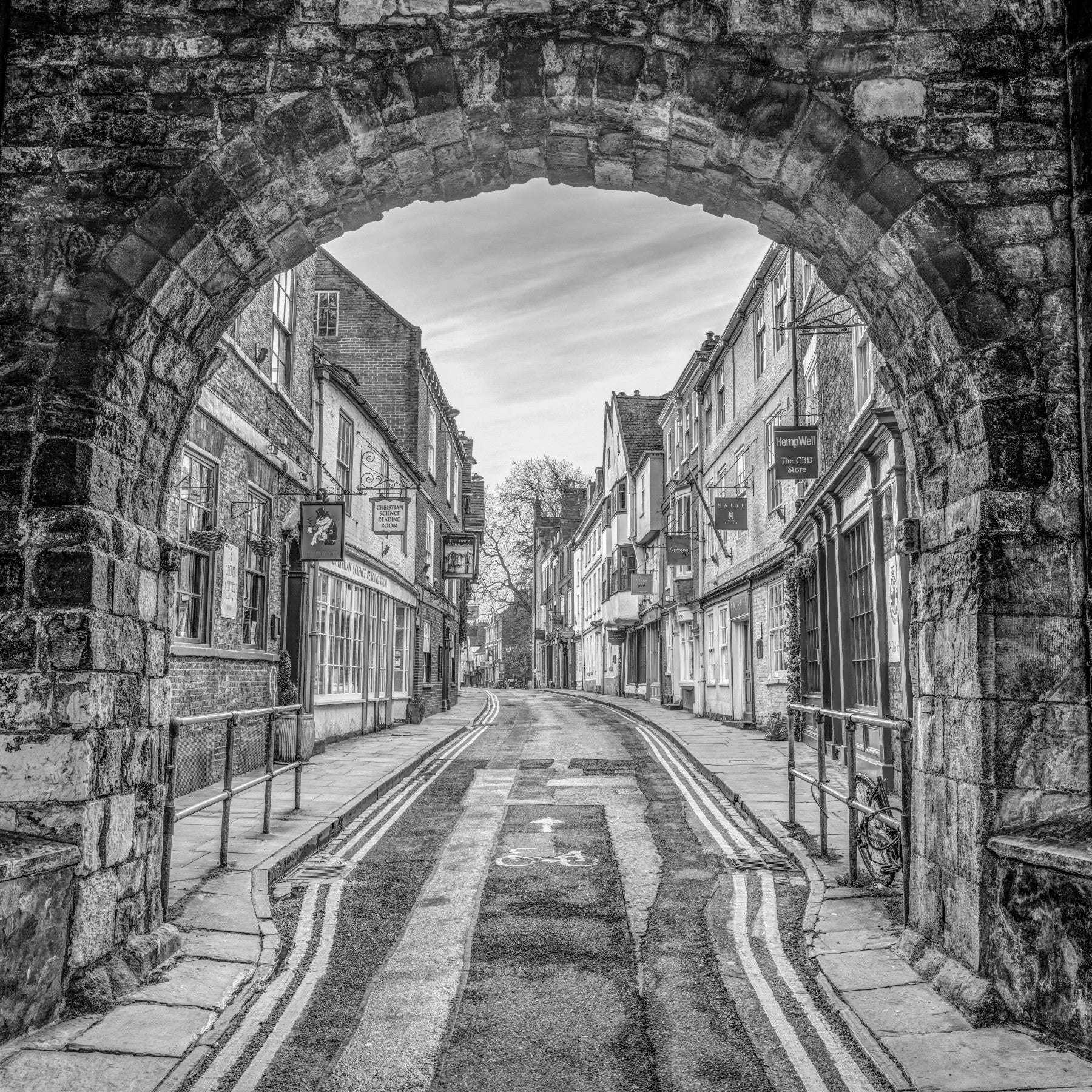 A beautiful, black and white photo of a historic stone archway leading to a street.