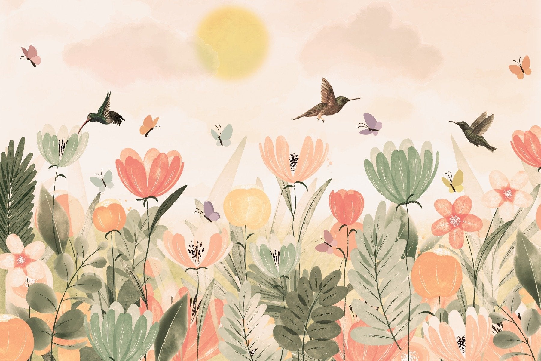 Discover the allure of the cheerful spring blossoms mural wallpaper, a masterpiece that captures the essence of the season. This exquisite watercolor wallpaper brings walls to life with its vibrant display of flora and fauna. Each stroke of color weaves a visual narrative, as delicate hummingbirds dance among a cascade of flowers. Perfect for anyone looking to add a burst of nature's beauty to their environment, this flower wallpaper is not just a design choice, but a statement of appreciation for artistry and the blossoming splendor of spring. Ideal for bedrooms, living areas, or any space that craves a touch of natural elegance, the cheerful spring blossoms design is a timeless addition to any home.