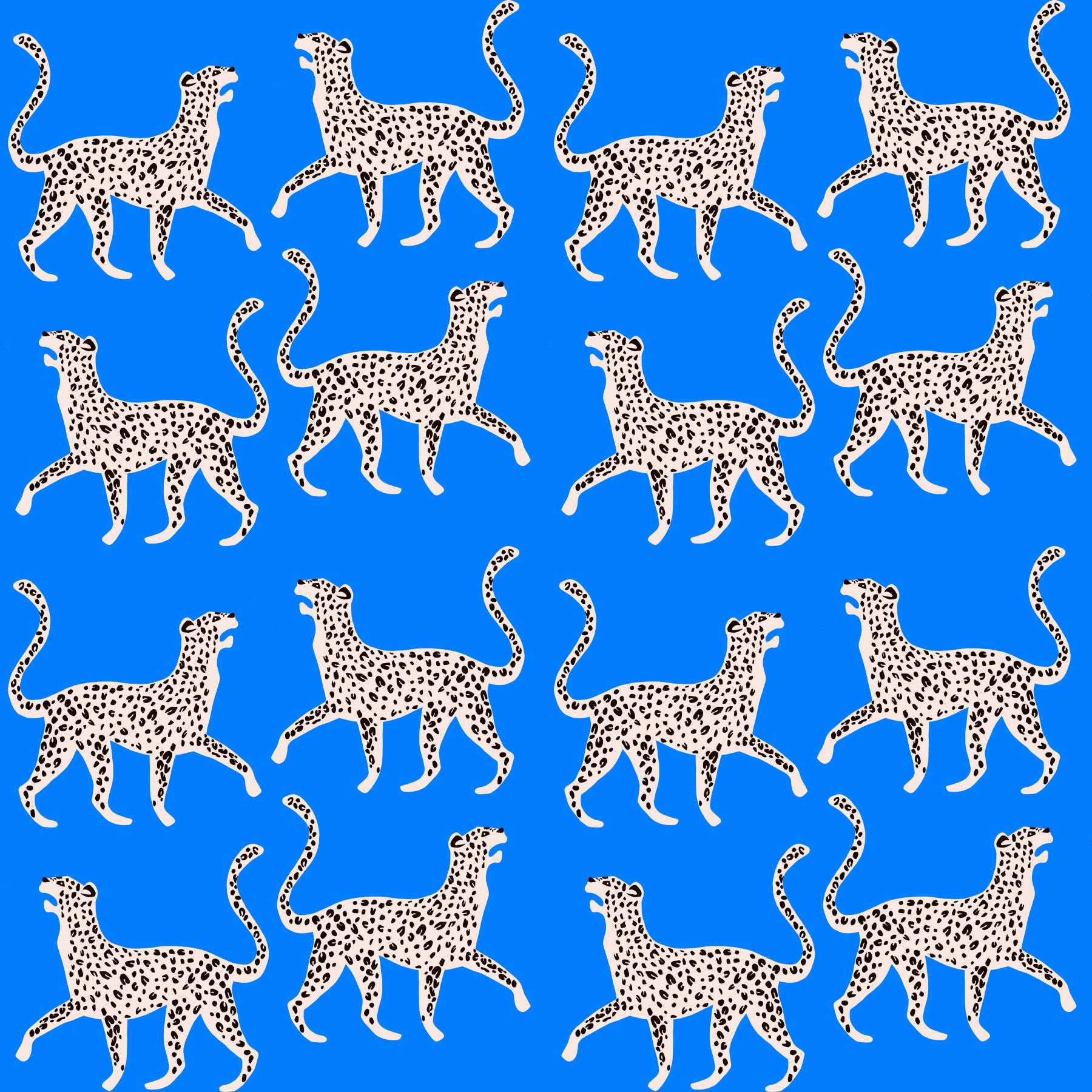 Experience the thrill of the wild with 'Cheetah Chic 03'. This vibrant wallpaper showcases a bold, repeating pattern of stylized cheetahs in a striking off-white against a rich royal blue backdrop. The cheetahs, rendered with a sophisticated graphic design, exude a playful energy and fierce elegance. Their dynamic poses and distinct spots create a captivating rhythm across the design, making it a perfect statement piece for adding a touch of untamed luxury to any space. This wallpaper effortlessly blends exotic animal print with a modern, minimalist aesthetic, resulting in a chic and unforgettable design. Ideal for those who appreciate bold patterns and a touch of wild sophistication.