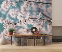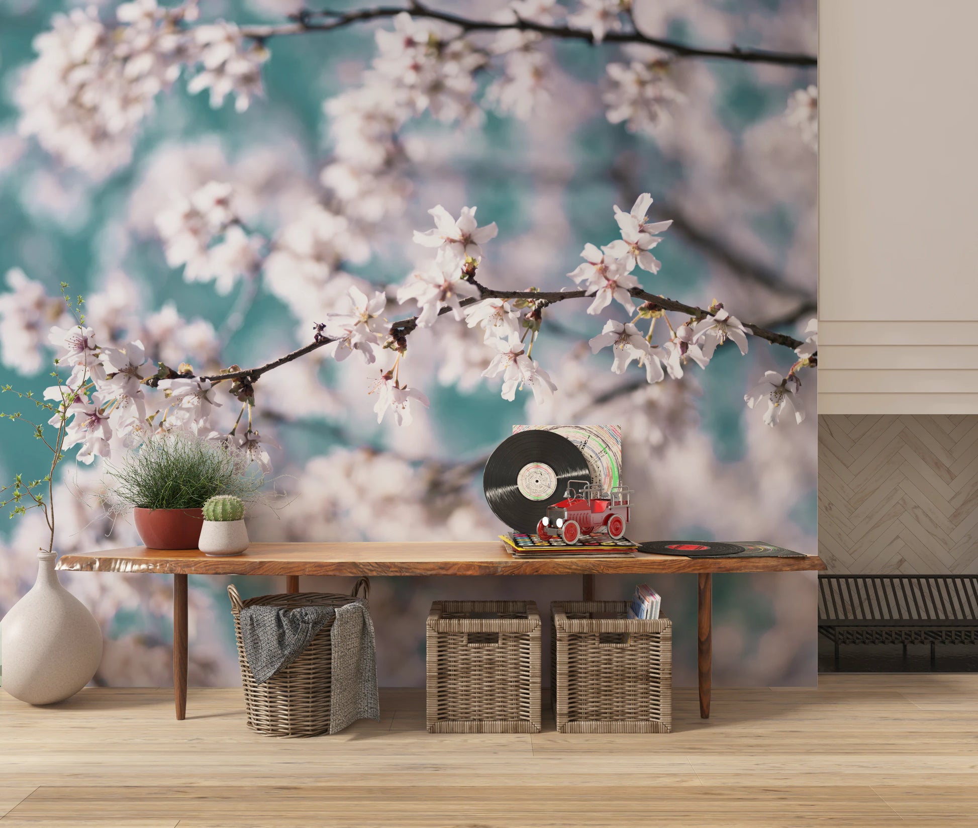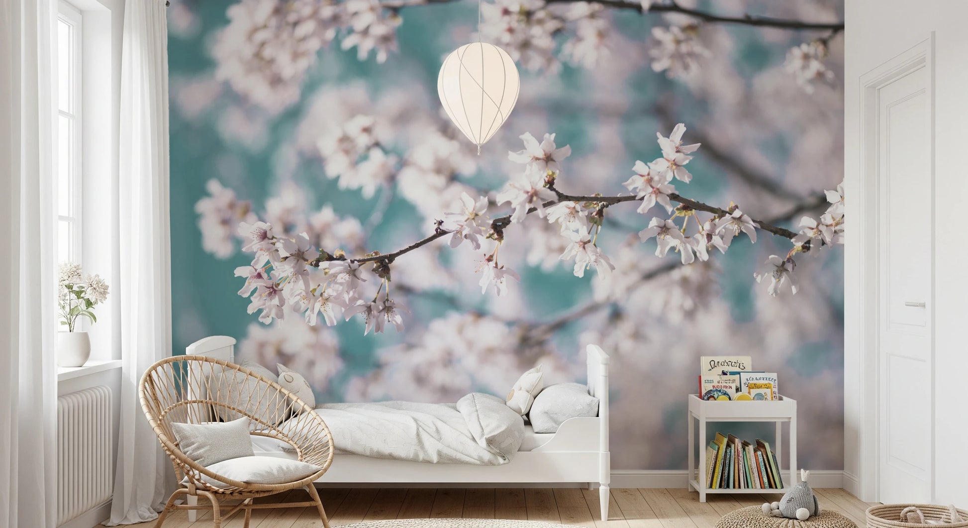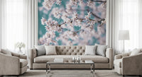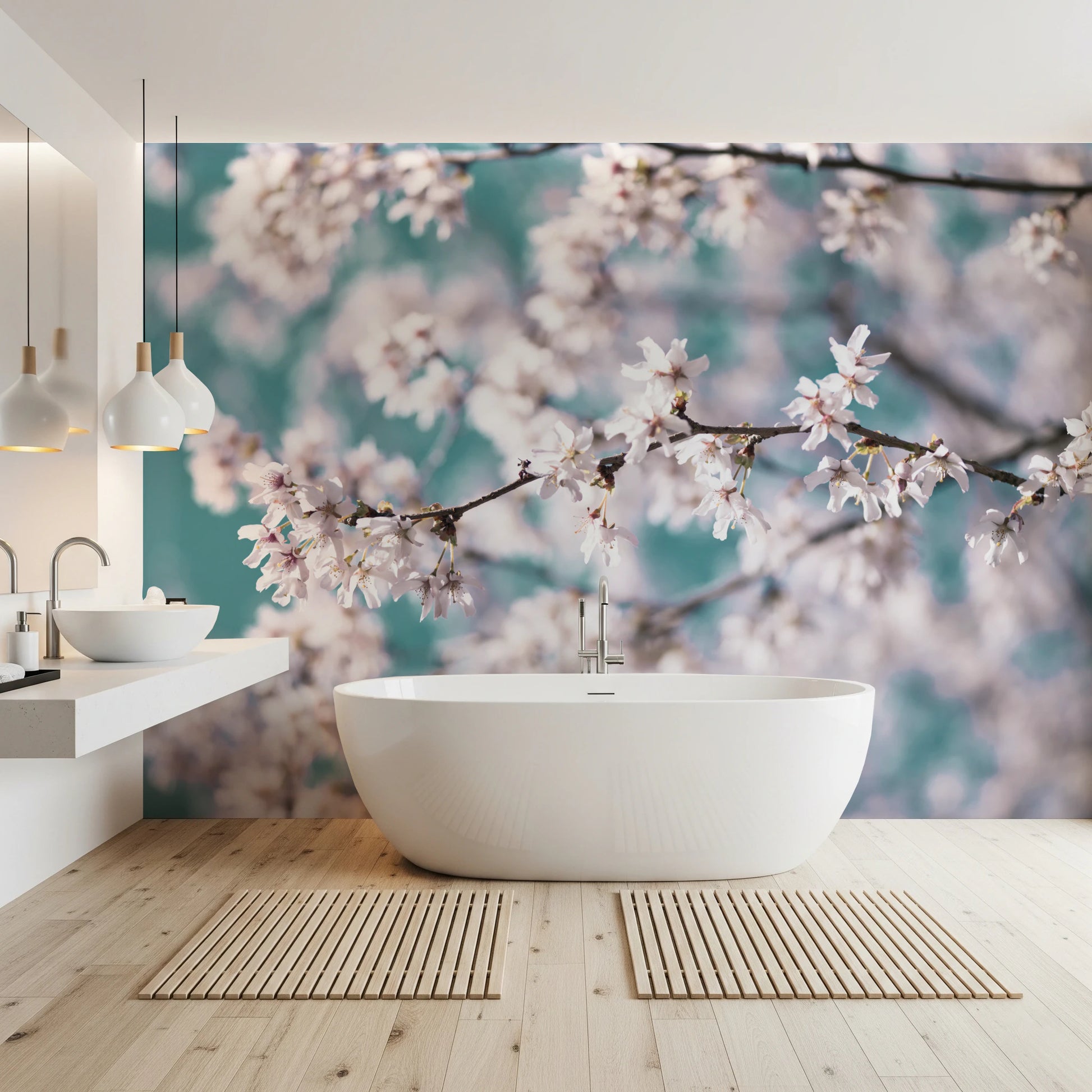 Invite the tranquility of a blossoming spring into your space with this soothing wallpaper for walls. The delicate cherry blossoms, rendered in soft, muted tones, cascade against a serene teal backdrop, creating an ambience of peacefulness. This design works beautifully in bedrooms, living rooms, or even hallways, bringing the outdoors in with a touch of elegance. The gentle colour palette complements a variety of décor styles, enhancing the sense of calm and serenity in your home. Create a relaxing retreat where natural beauty takes centre stage.