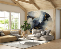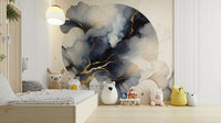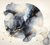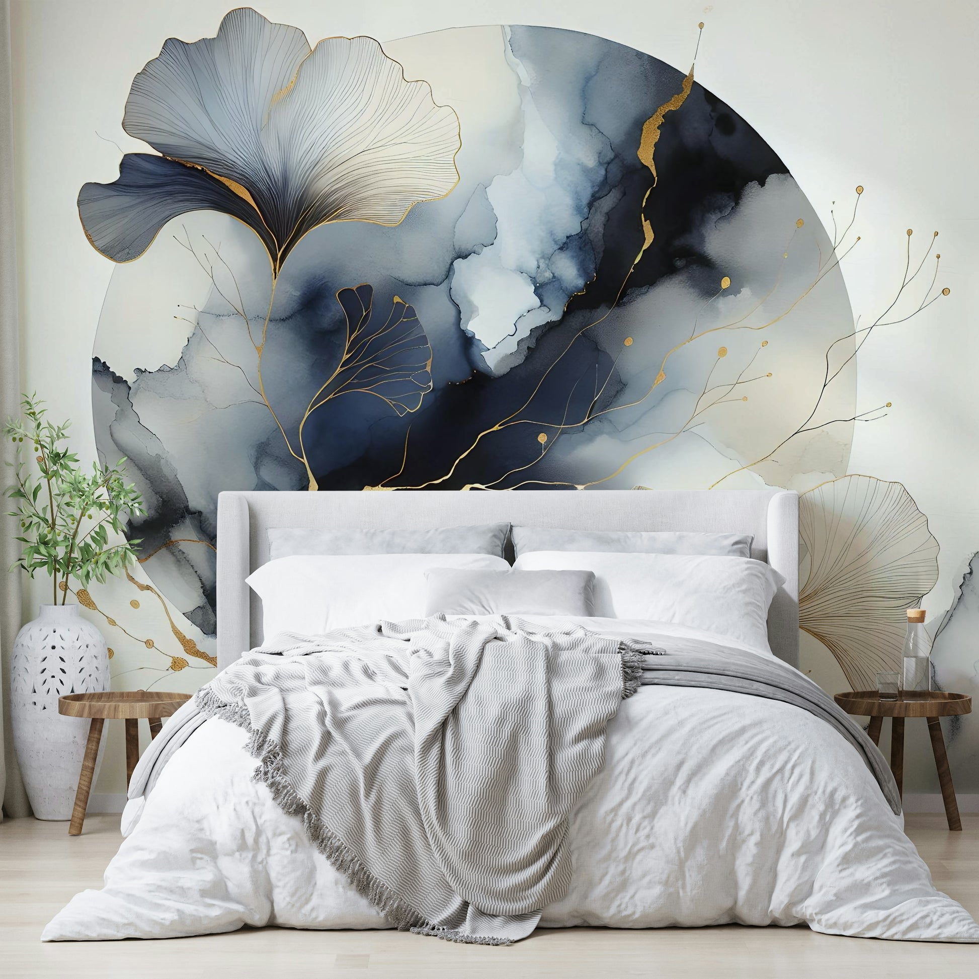 This wallpaper evokes a sense of tranquility with its abstract design. Delicate ginkgo leaves in shades of gray and blue are beautifully rendered, their fine lines contrasting with the fluid, flowing forms of the alcohol ink background. Subtle touches of gold add a touch of luxury and elegance, enhancing the overall ethereal atmosphere. The circular composition creates a sense of harmony and balance, making it a perfect choice for a calming and sophisticated space. The piece is both minimalist and artistic, offering a visually appealing yet understated aesthetic.