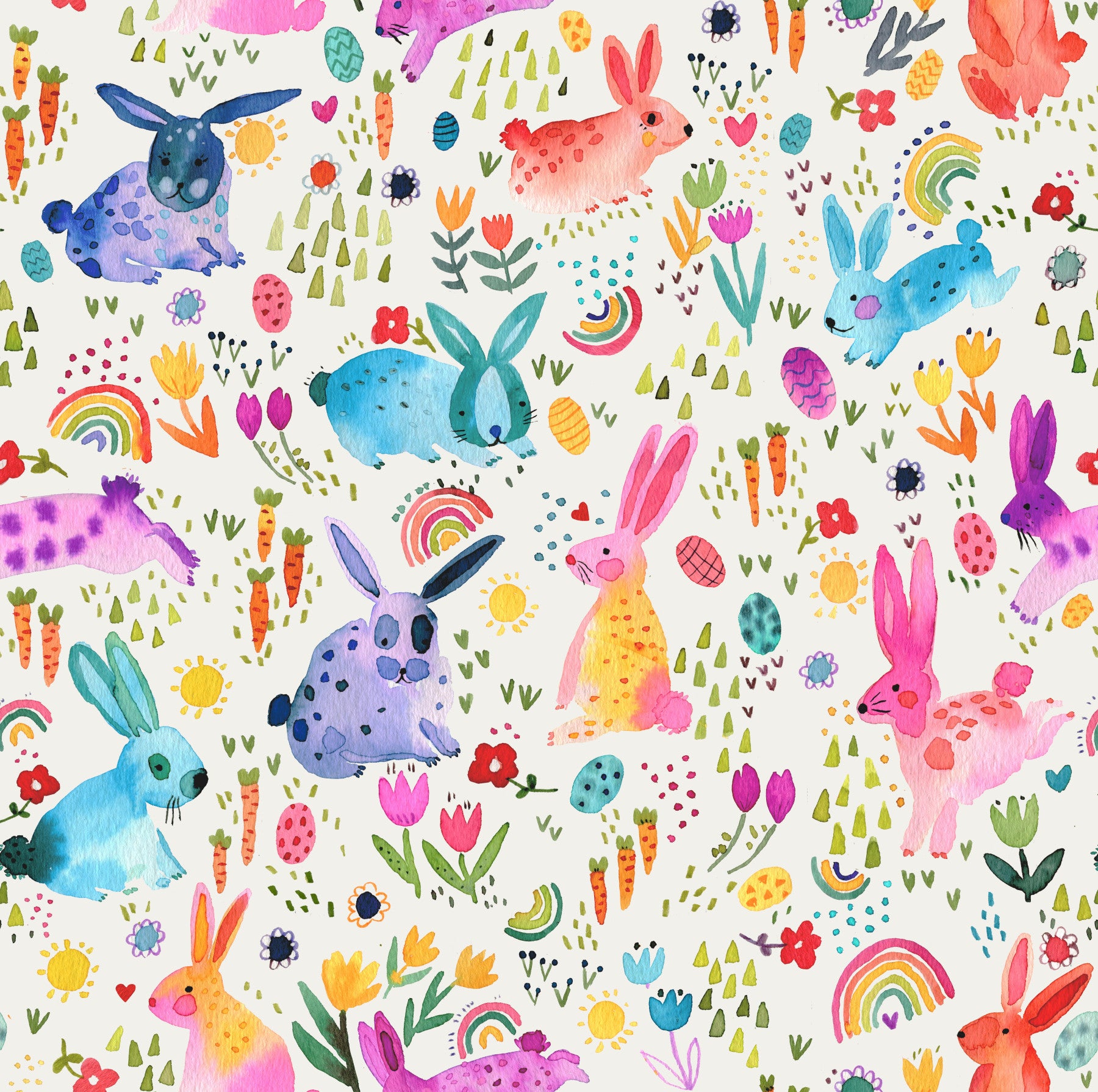 Celebrate Easter with this vibrant and whimsical wallpaper! A delightful array of colorful rabbits frolics amongst a blooming meadow, filled with bright flowers, carrots, rainbows, and Easter eggs. The cheerful watercolor style evokes a sense of childlike wonder and joy, perfect for adding a touch of springtime magic to any digital device. This charming design is brimming with Easter spirit, making it an ideal choice for celebrating the holiday or simply brightening your day with its cheerful aesthetic. The playful rabbits and vibrant colors create a fun and festive atmosphere, radiating happiness and warmth.