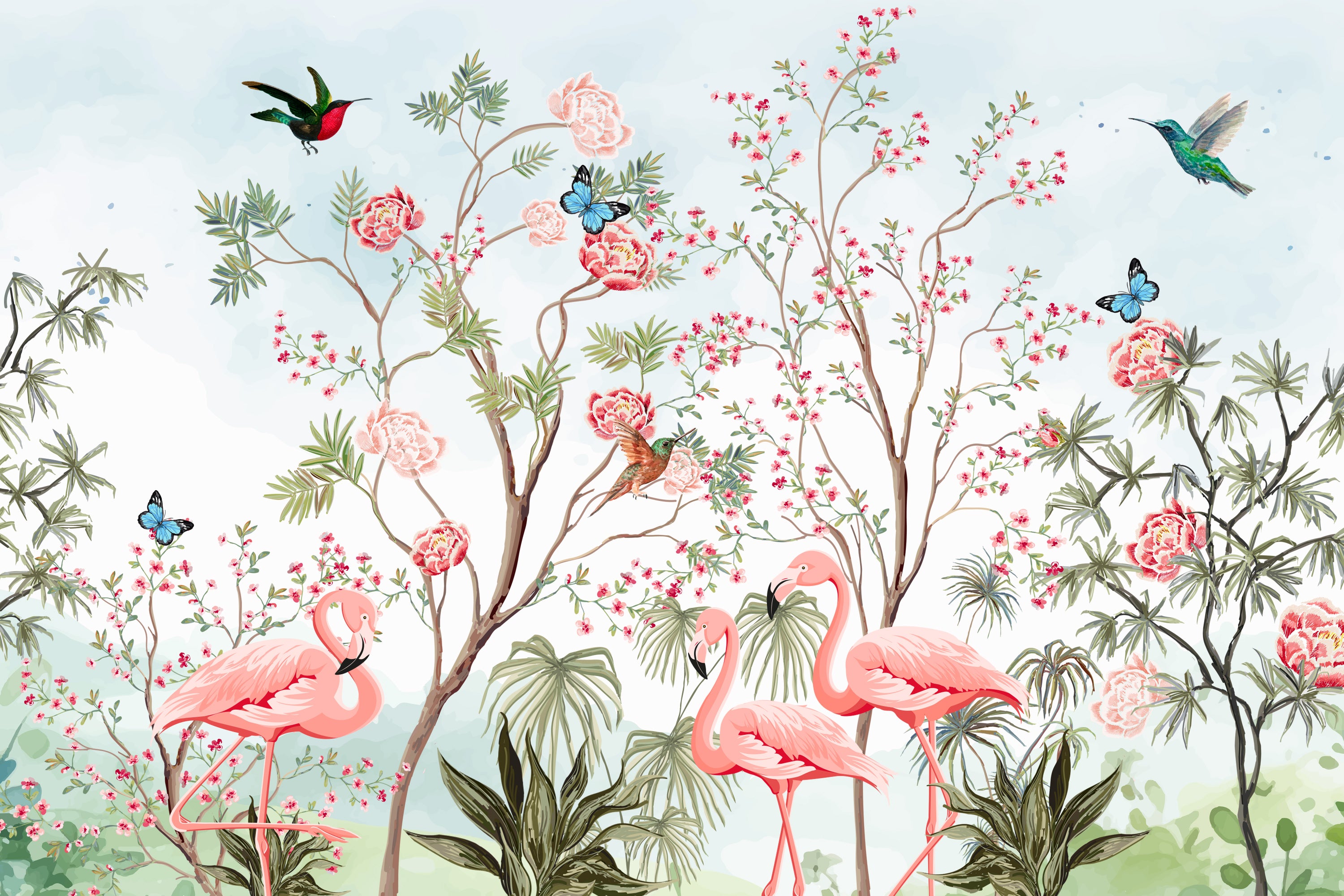 Graceful flamingos in a chinoiserie floral scene