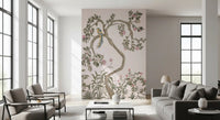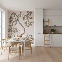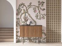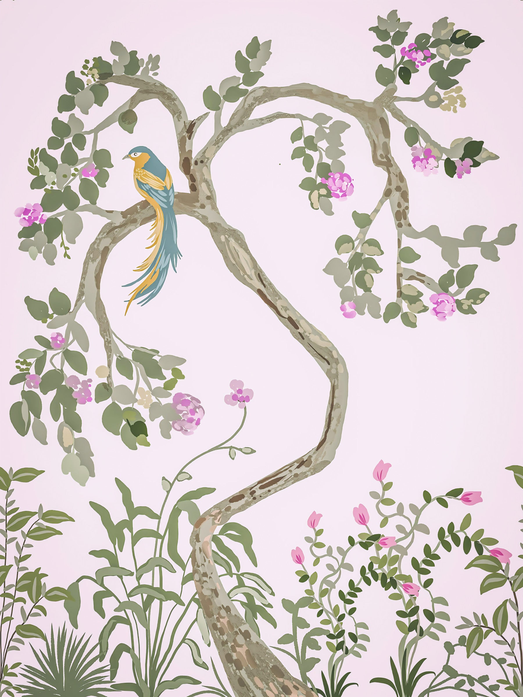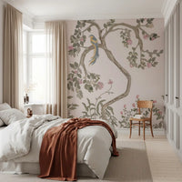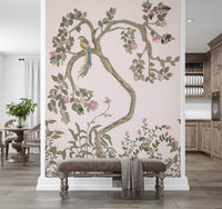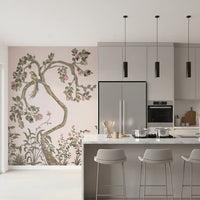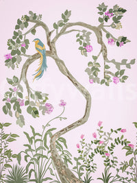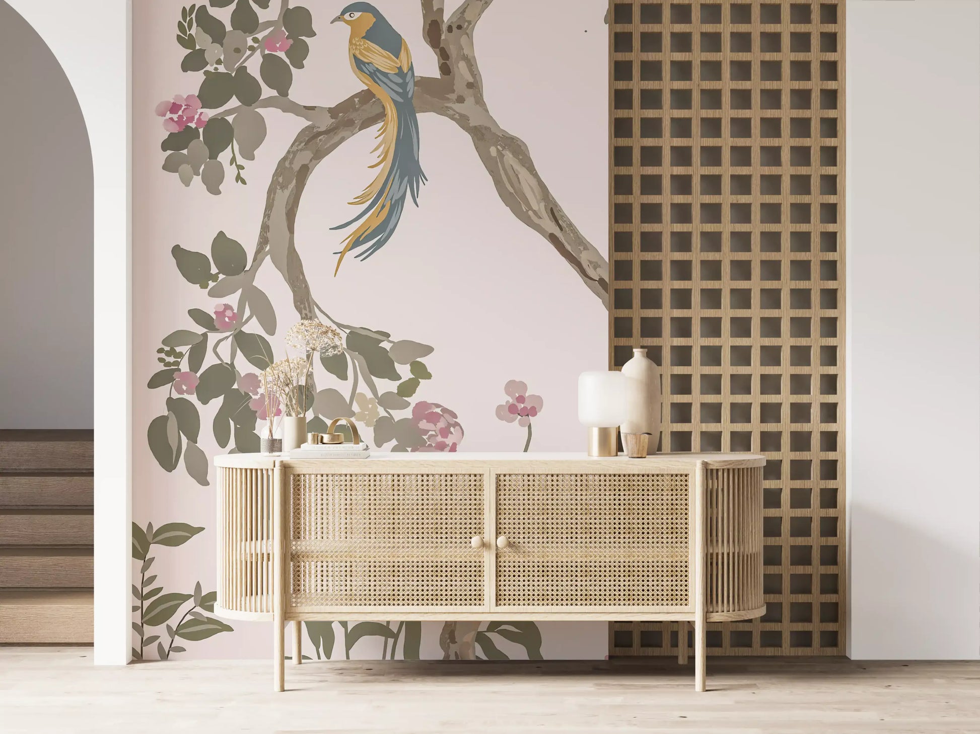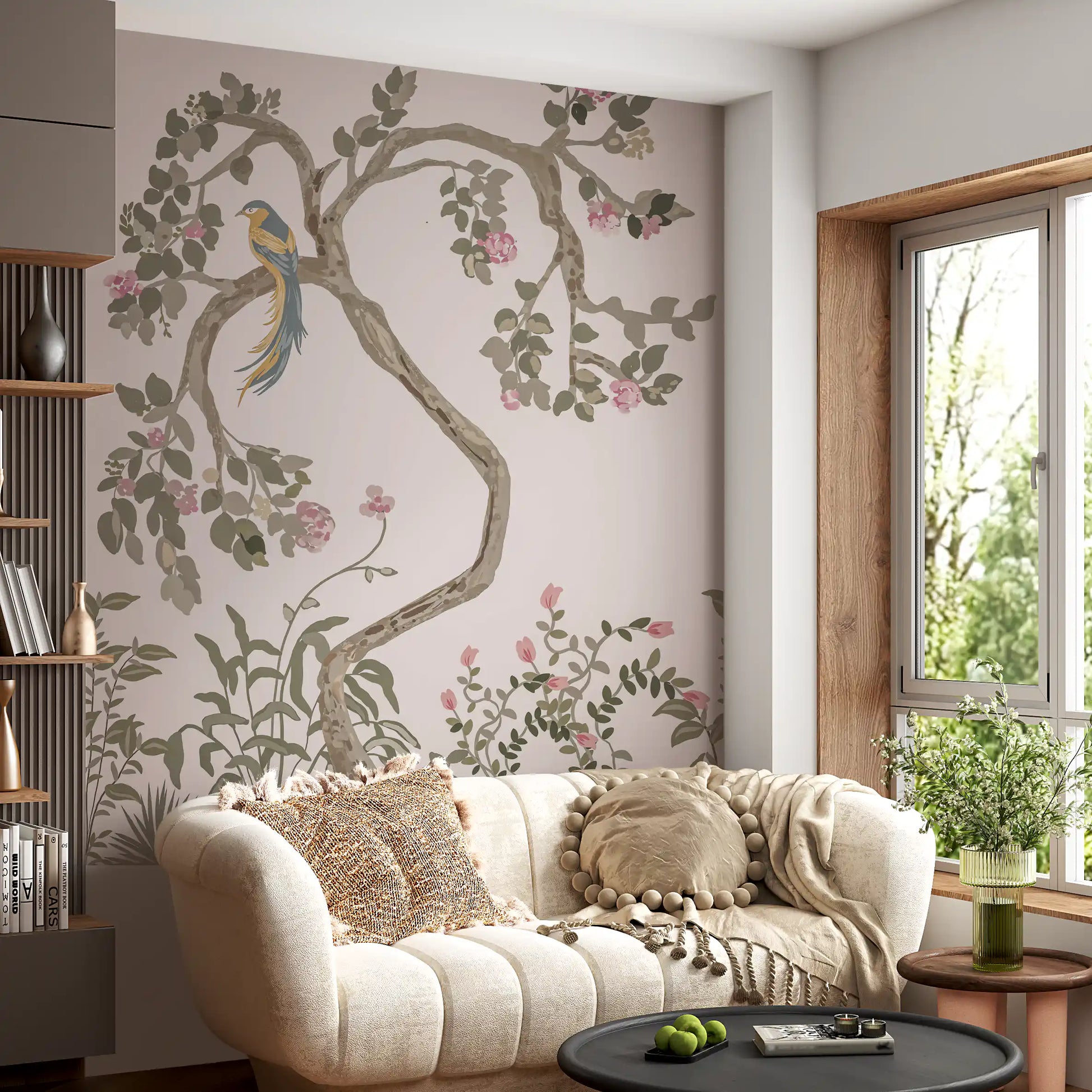 Transform your living space into a serene sanctuary with our exquisite Chinoiserie Garden wall decor. This captivating design effortlessly blends timeless elegance with natural beauty, featuring a majestic, winding tree whose branches gracefully extend across the canvas. Perched amidst the lush, subtly shaded foliage and delicate pink blossoms is a magnificent bird, its vibrant blue-grey and golden plumage adding a touch of exotic charm and a lively focal point to the tranquil scene. The soft, gentle background enhances the artistic, painterly quality of the botanical elements, creating an atmosphere of sophisticated calm. Ideal for those seeking to infuse their interiors with an enchanting, oriental-inspired aesthetic, this wall covering evokes the peaceful allure of a blooming garden, inviting relaxation and visual delight. It’s more than just decor; it's a window to a beautifully imagined world.