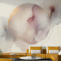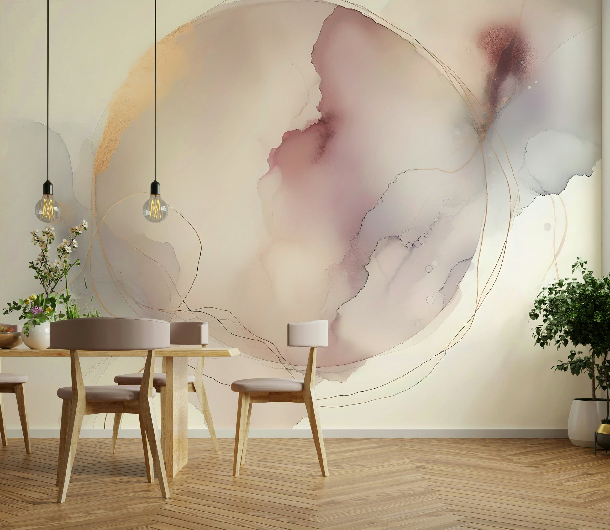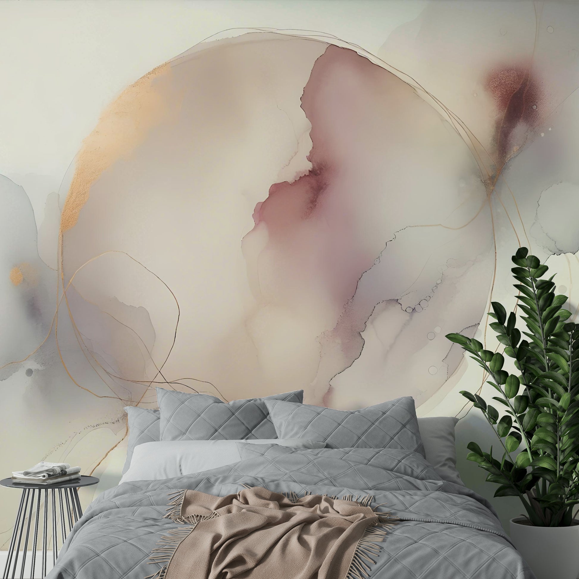 This ethereal wallpaper captures the essence of serene beauty. Delicate washes of blush pink, soft grey, and subtle gold create a dreamy atmosphere. Thin, elegant lines intertwine with the fluid forms, adding a touch of sophistication and intrigue. The overall effect is calming and peaceful, perfect for creating a tranquil and elegant space in any room of your home. The soft color palette and flowing design evoke a feeling of gentle movement and understated luxury. Ideal for bedrooms, living rooms, or meditation spaces where a sense of calm and sophistication is desired.