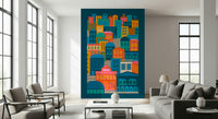 Geometric, colourful architecture buildings, high-rises and houses with a night moon in fun retro Rainbow Brights: Dark Blue, Royal Blue, Coral Orange, Yellow, Pink, Turquoise, Brown and Cream with striped backdrop! Bright, pop and fun cityscape inspired by vintage travel posters! Be sure to check out my co-ordinating "City Lights By Day" Wall Mural too, they make a great pair AND this Wall Mural (great for a statement wall!) is also available in a Repeat Pattern Design wallpaper version too! Original Wall Mural design by Jackie Tahara of UnBlink Studio.