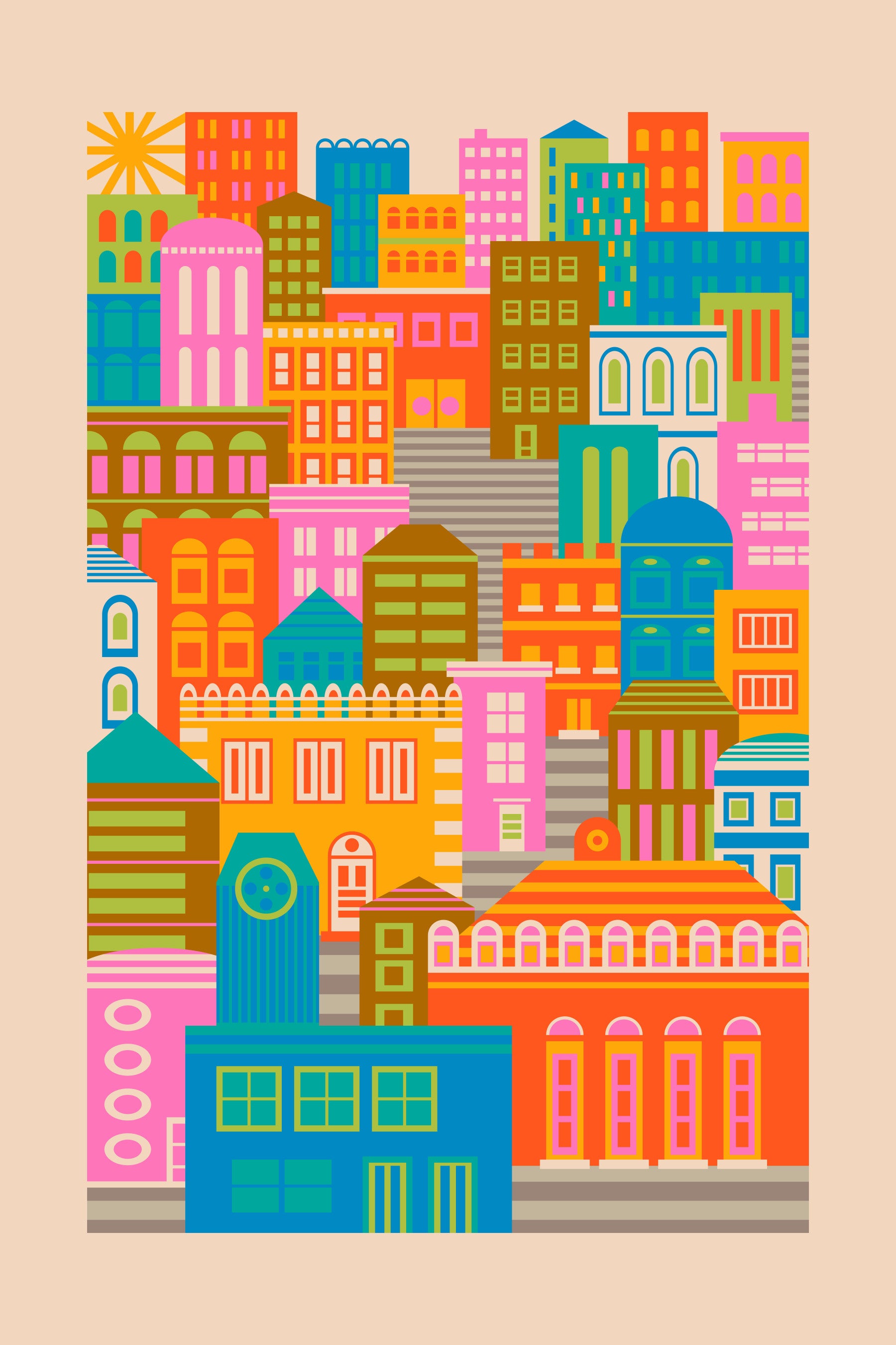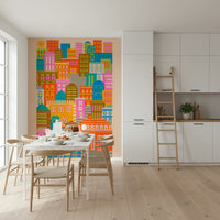 Geometric, colourful architecture buildings, high-rises and houses with sunshine in fun retro Rainbow Brights: Royal Blue, Coral Orange, Yellow, Pink, Turquoise, Green, Brown and White with striped backdrop! Bright, pop and fun cityscape inspired by vintage travel posters! Be sure to check out my co-ordinating "City Lights At Night" Wall Mural too, they make a great pair AND this Wall Mural (great for a statement wall!) is also available in a Repeat Pattern Design wallpaper version too! Original Wall Mural design by Jackie Tahara of UnBlink Studio.