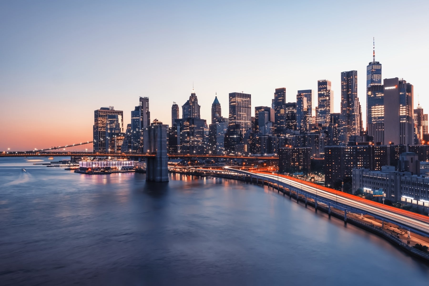 Transform your space with this captivating cityscape. Watch as the city comes alive at dusk, boasting a stunning skyline. Long exposure shots capture trails of light across the bridges and the water. The gentle blend of pink and blue skies mirrors in the water, giving a peaceful vibe. This wallpaper for walls is ideal for creating a focal point in your living room, home office, or bedroom. Let it bring a touch of urban style into any modern or contemporary interior.