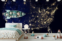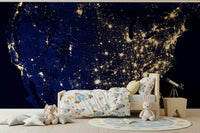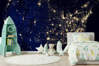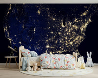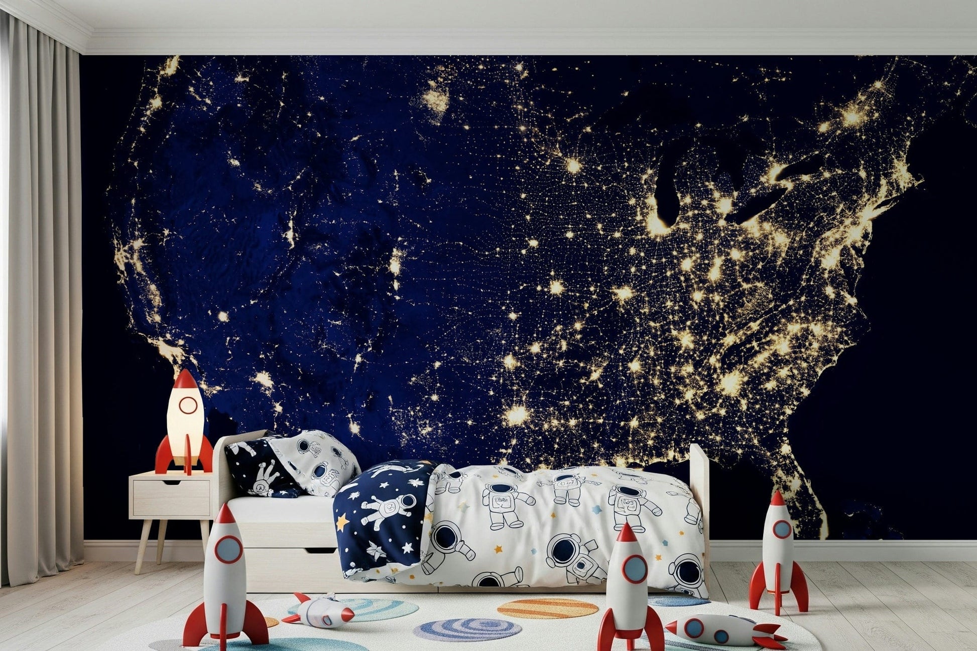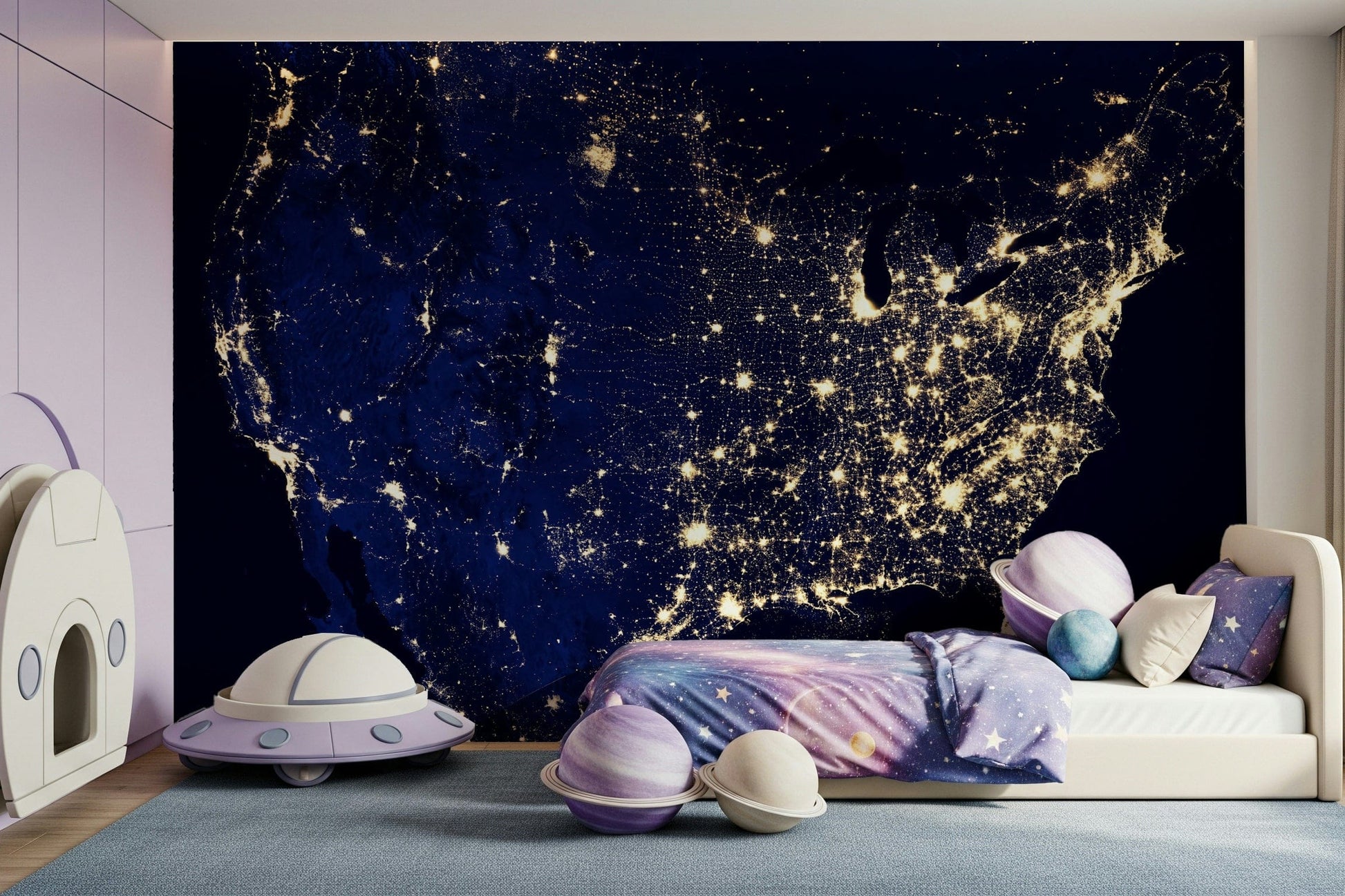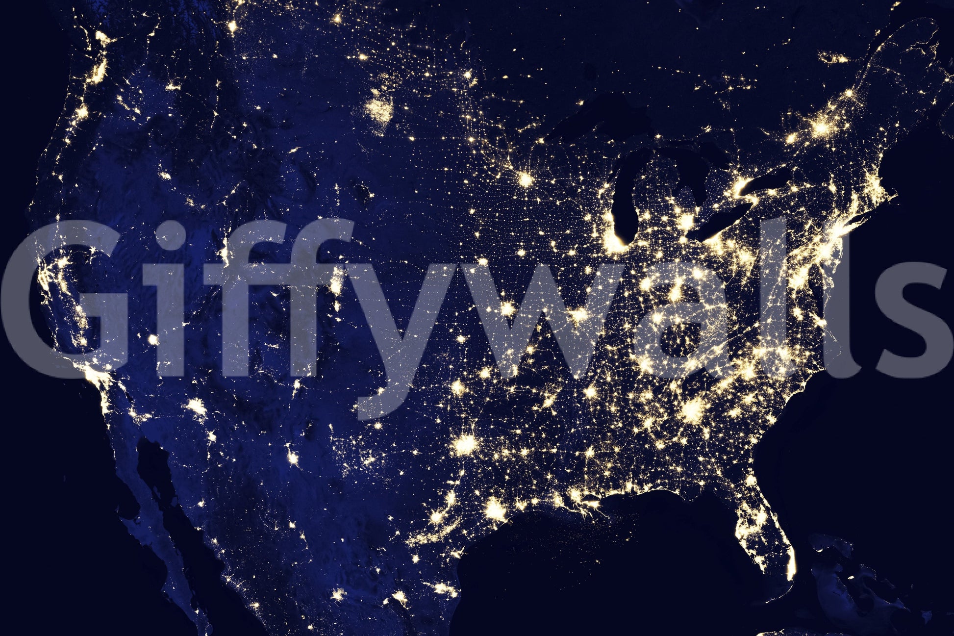 Transform your walls with this stunning depiction of the United States at night. The wallpaper for walls showcases the brilliance of urban centres and the interconnectedness of communities across the nation. A deep blue backdrop contrasts with the warm golden glow of city lights, creating a dramatic and captivating effect. This design works beautifully in a modern living room, a home office, or even a teen’s bedroom, adding depth and a sense of wonder to the space. It is perfect for sparking conversation and enhancing the sophistication of interior schemes.