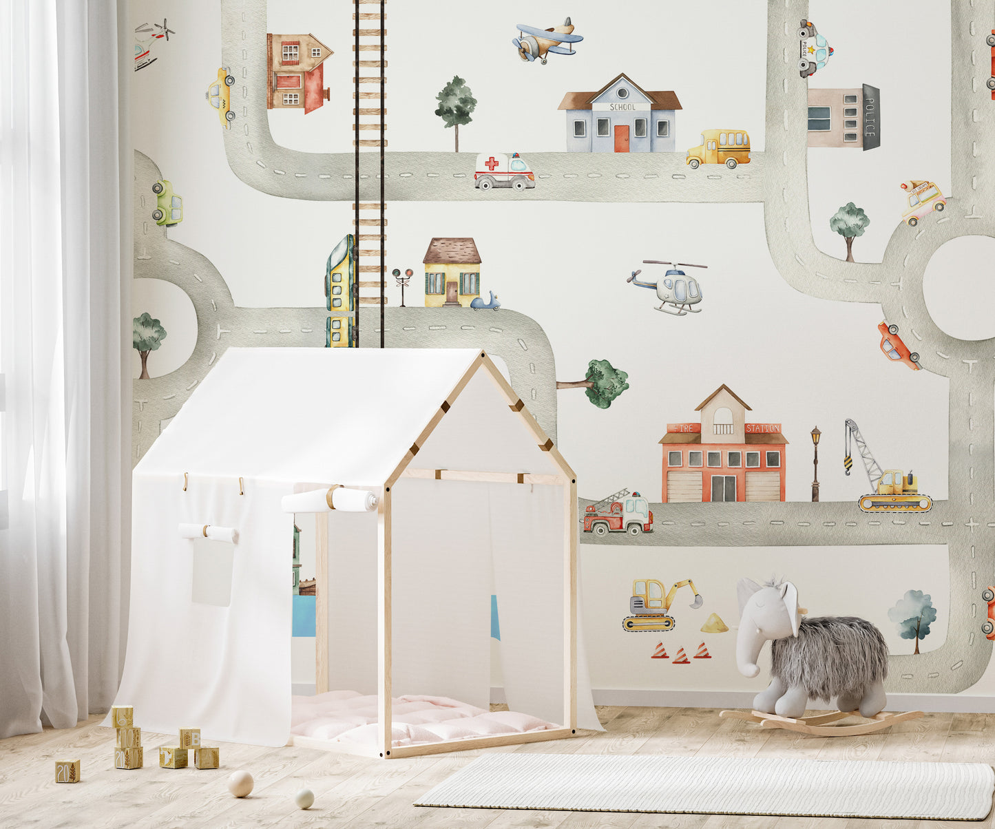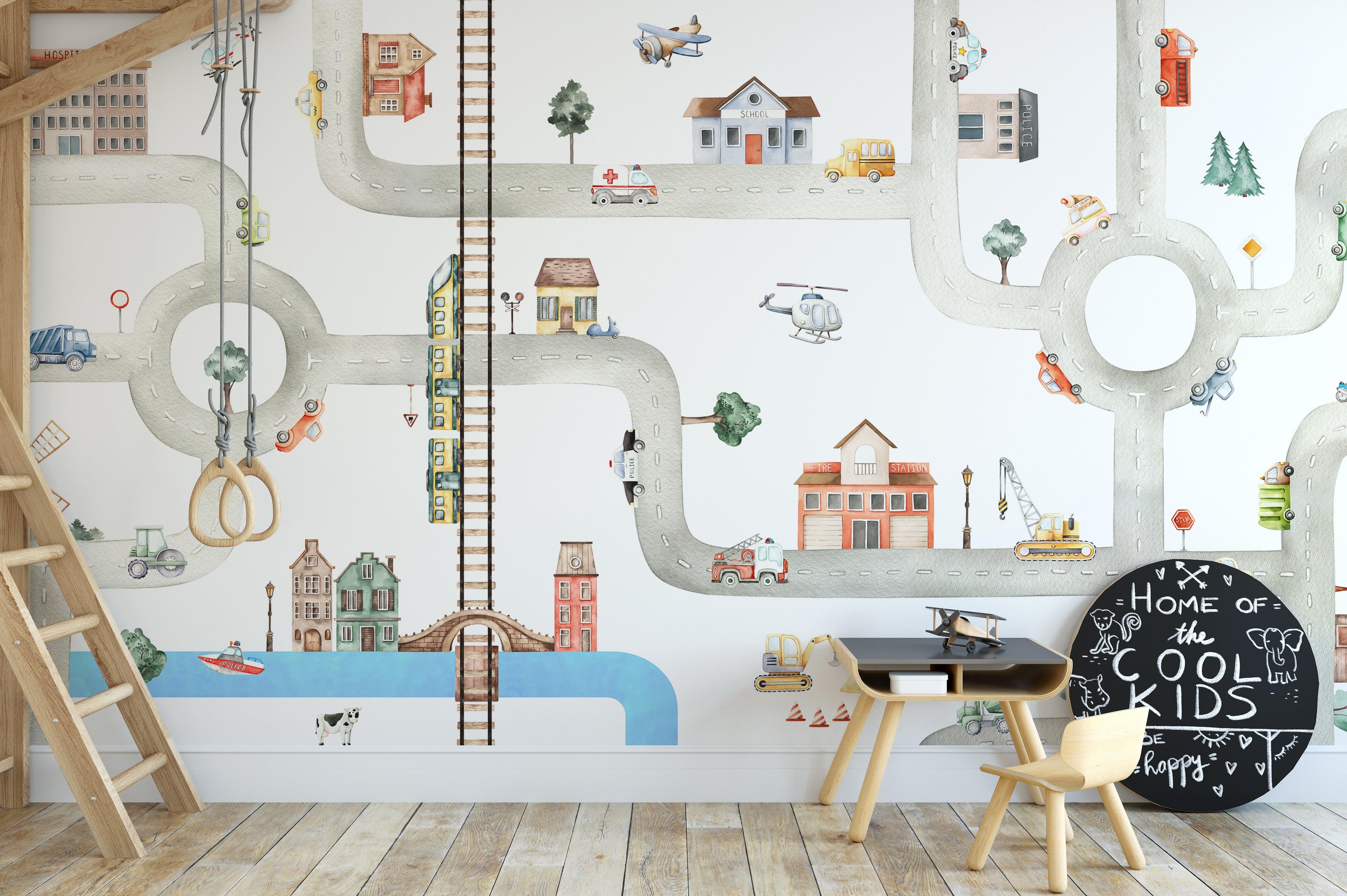 Give your child’s room a cosmopolitan makeover with City of Vehicles Wallpaper featuring the bustling crowd of the urban metropolis. It's creative with modern elements and displays a game-like character with a brainstorming puzzle. The interconnected tunnels feel like an innovative play, which sparks the imaginative instinct of the little one. It's a transportation-themed wallpaper with small cars, helicopters, bullet trains, and more, adding captivating allure to the space. Perfect for kids' playroom, this city vehicles wallpaper promises never-ending entertainment to the children who love something exciting. Creative in every way, this product is crafted with eco-friendly materials and is safe for spaces with high traffic.